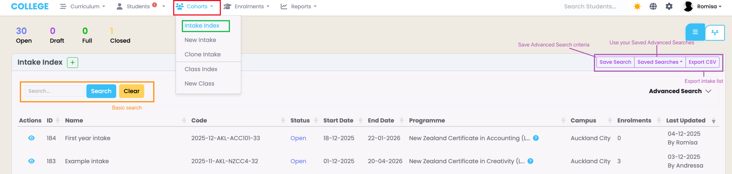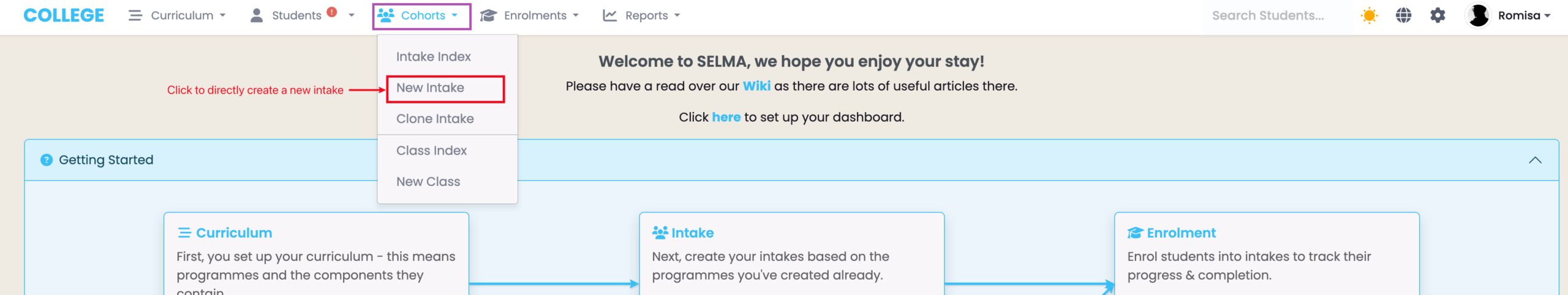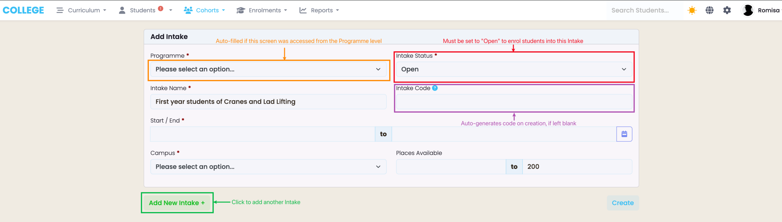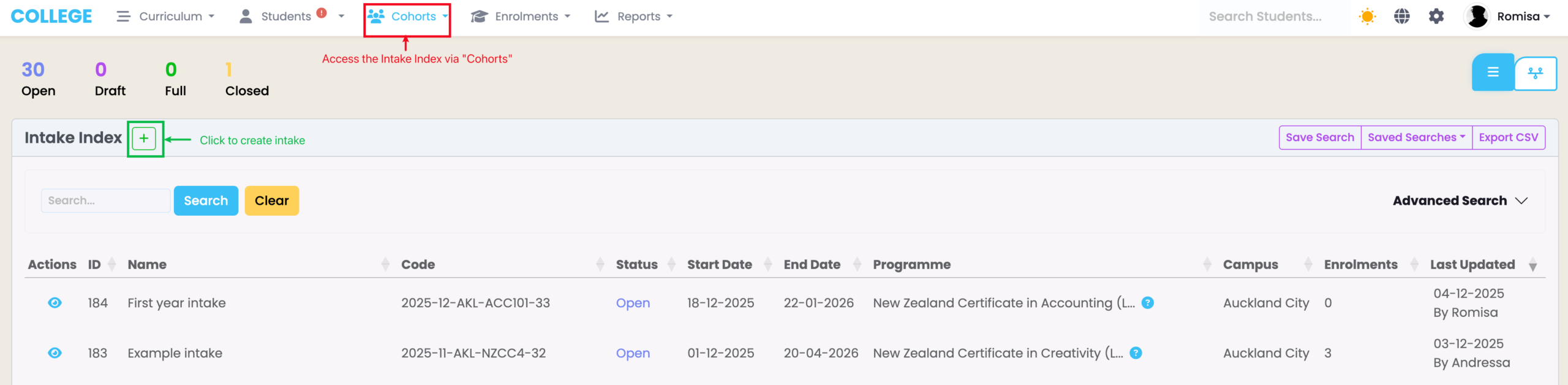 - Navigate to “Cohorts” and click “New Intake” in the navigation drop-down list (Figure 4.).