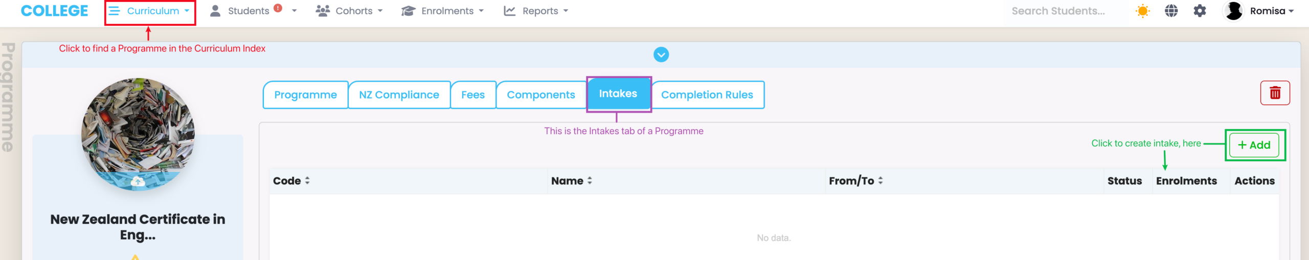 Figure 2. Create a new intake via the Intakes tab of a Programme in the Curriculum Index (green).