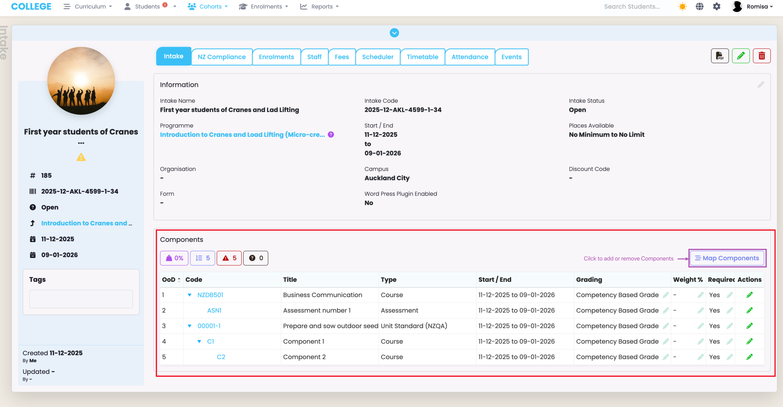 On an Intake profile, you will notice a Components section. This section displays the Components inherited from the associated Programme of the intake, which are in turn inherited by Students/Enrolments when linked to an Intake, later. (Figure 6.).