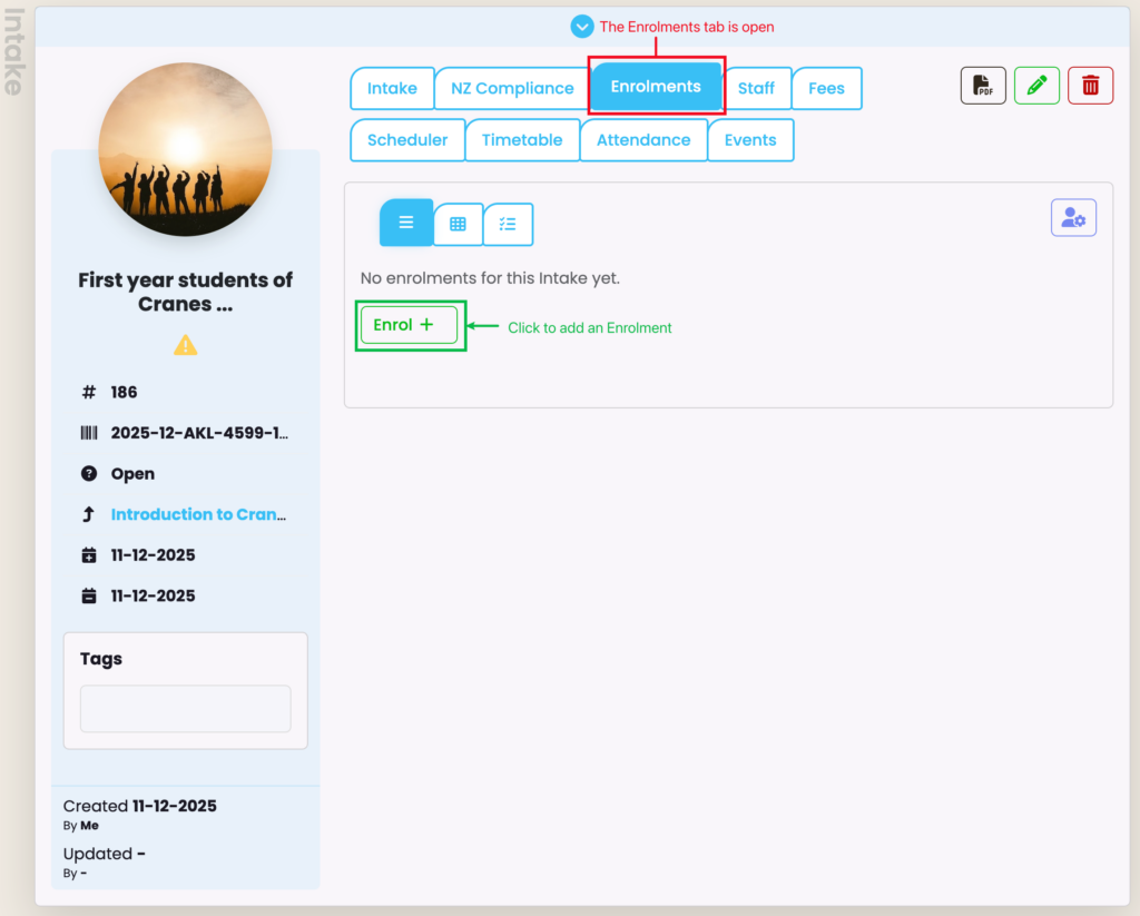 Once Intakes have been created, you may edit values within their profiles and begin enrolling Students into the Intake from the Enrolments tab (Figure 7.).