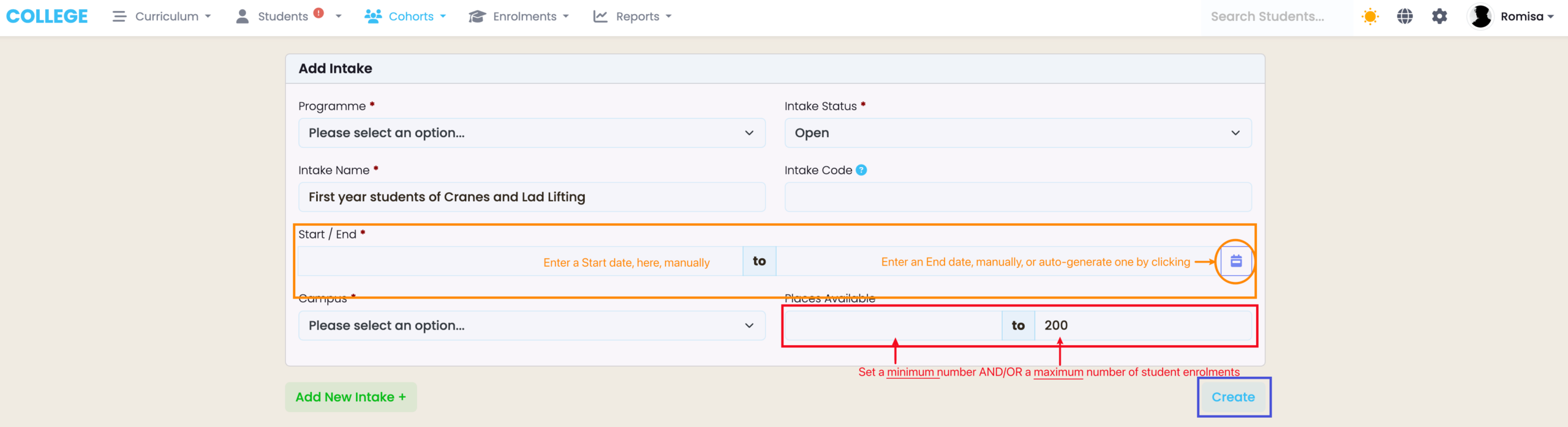 Figure 5ii. Enter the Start/End dates of the Intake, manually, or auto-generate an End date if the associated Programme duration has been set (orange). You can also set limits for the number of student enrolments this Intake allows (red). Click the “Create” button (blue) when you have filled all necessary details.