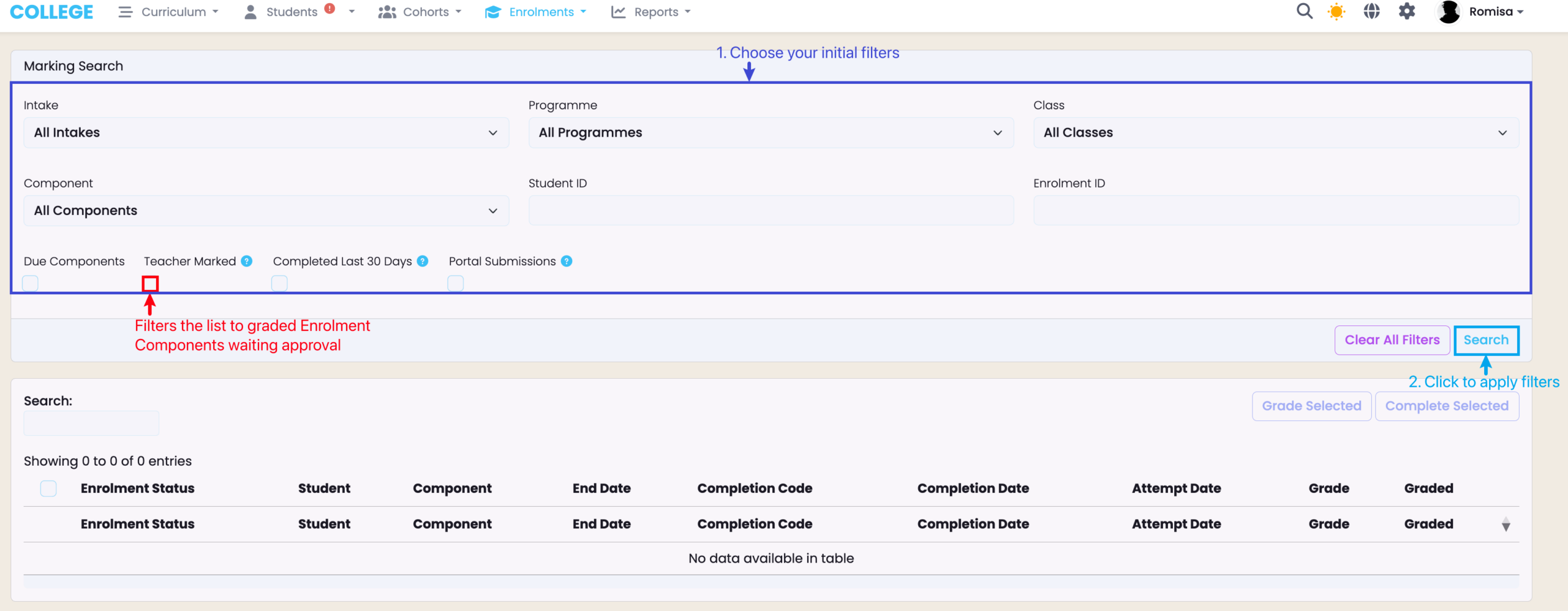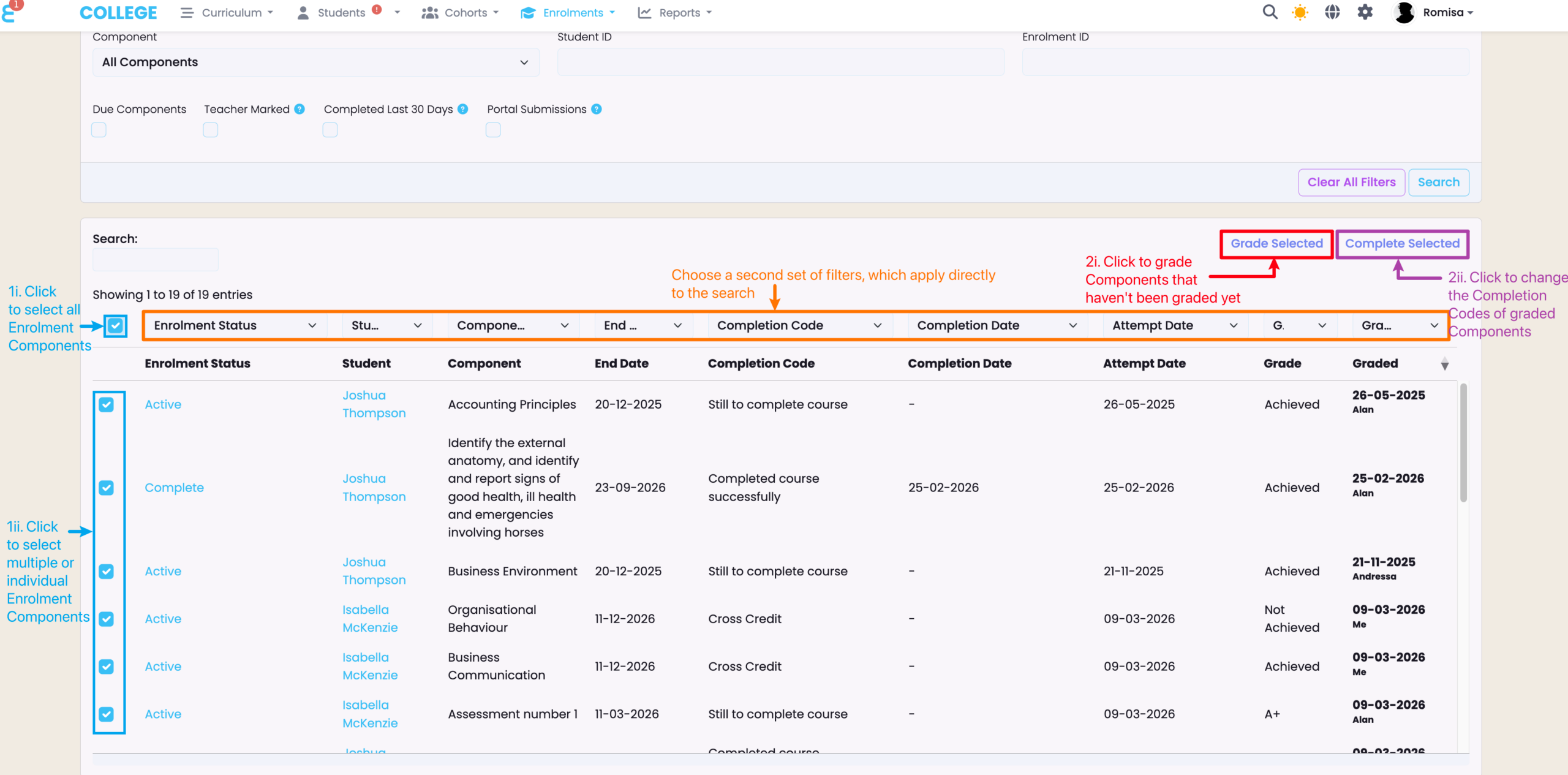You can do a second round of filtering when the list appears after your initial search (orange), and grade Enrolment Components, which haven’t been graded yet (red), or change Completion Codes of graded Enrolment Components (purple).