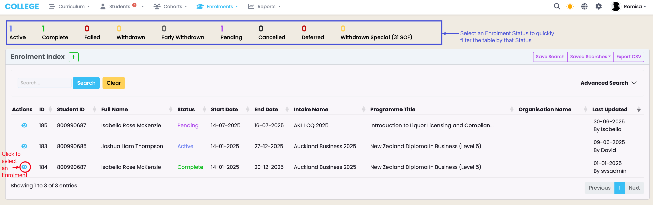 Click the eye icon to open an Enrolment page (red).