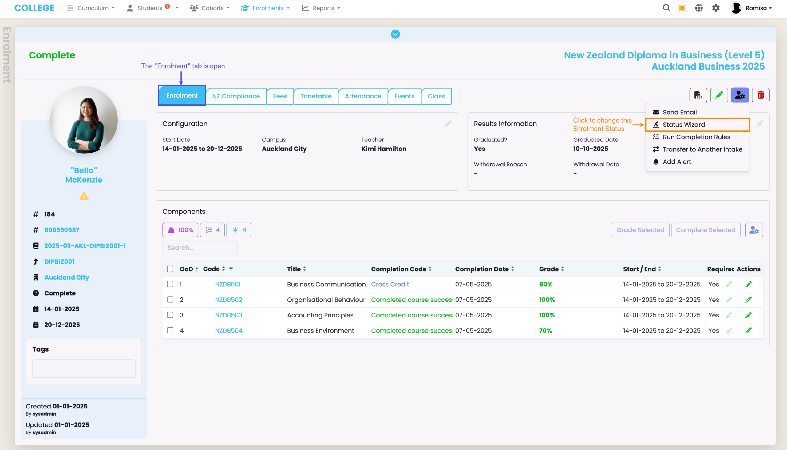 When a Student meets the requirements to complete a Programme, change the Completion Status of the Enrolment to “Complete“.