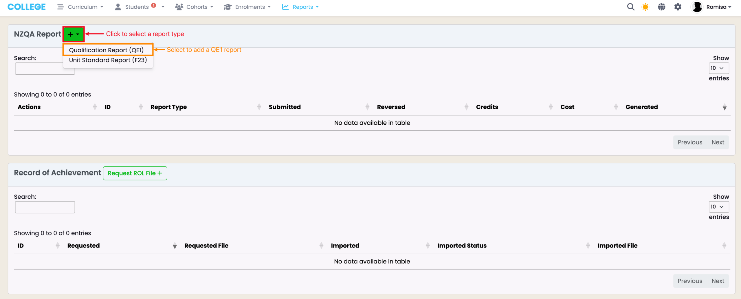 Click the green “+” button next to the heading “NZQA Report” (red), and select “Qualification Report (QE1)” (orange).