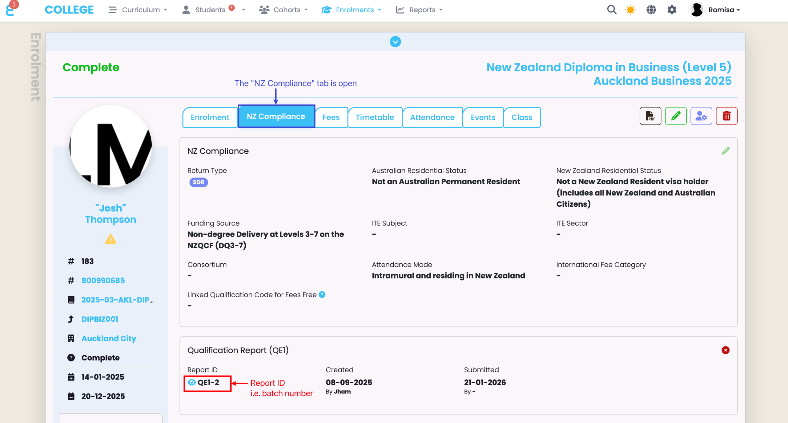 Navigate to an Enrolment linked to the Qualification and check that there is a “Report ID” present (red). This indicates that the Qualification has been reported to NZQA as a batch file submission.