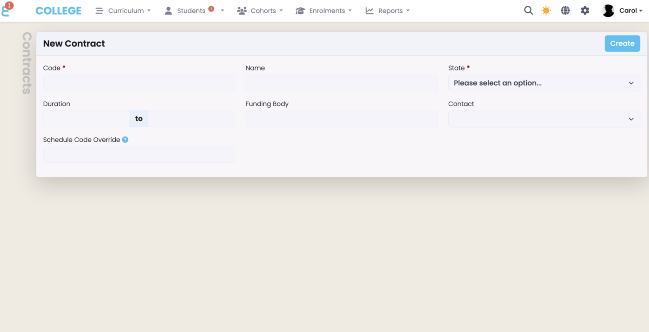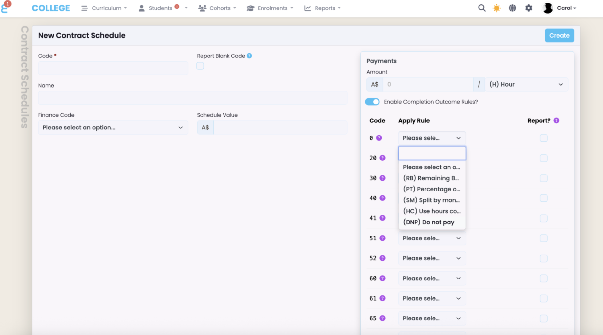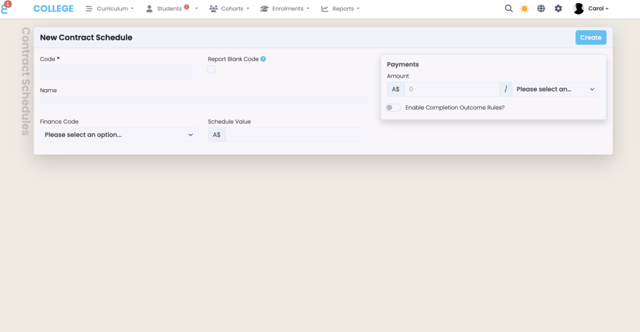 Click “Create”. The Contract Schedule is now active and available to assign to enrolments.