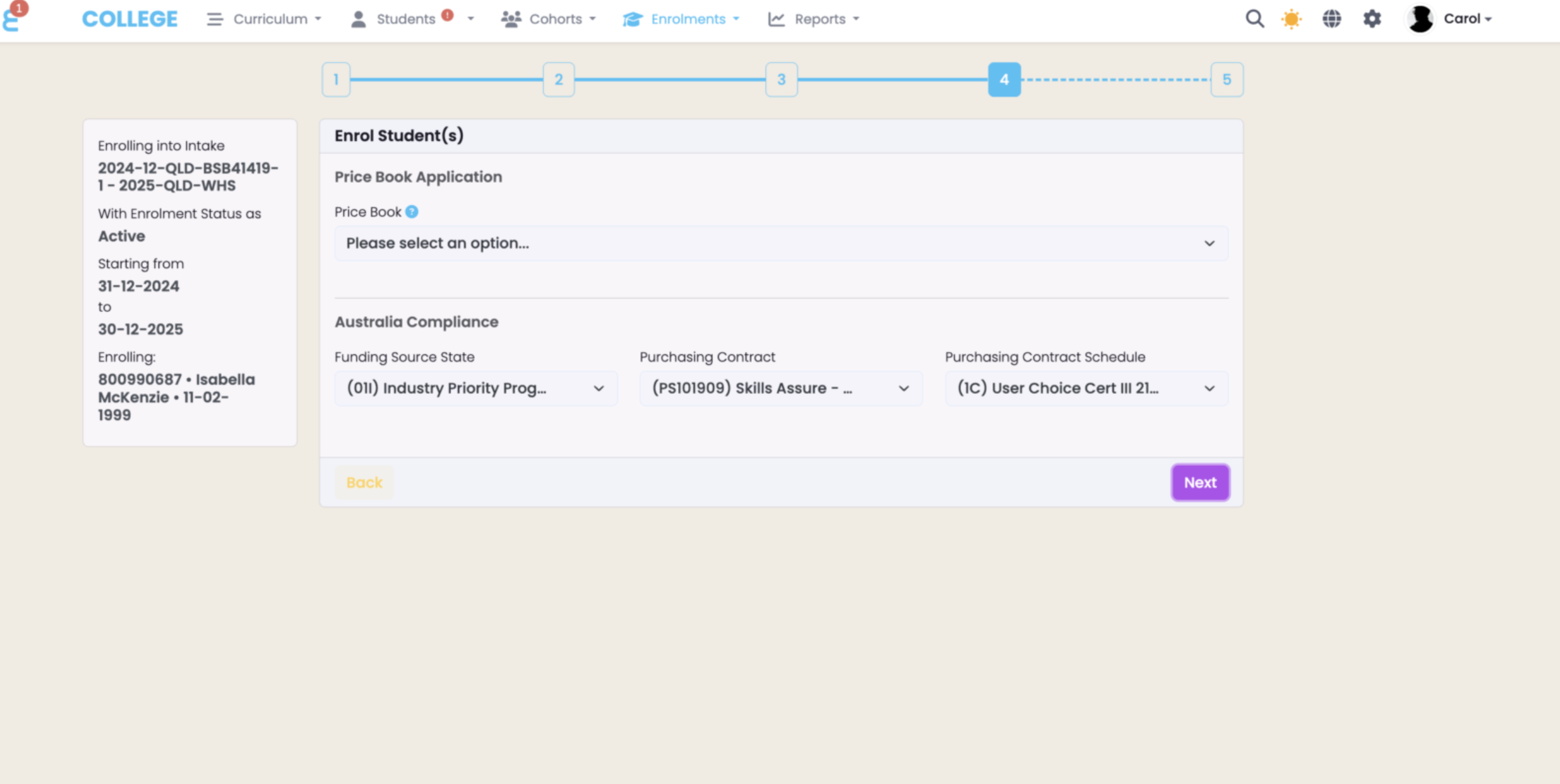 Use this option when an enrolment already exists and needs to be linked to a purchasing contract and schedule.