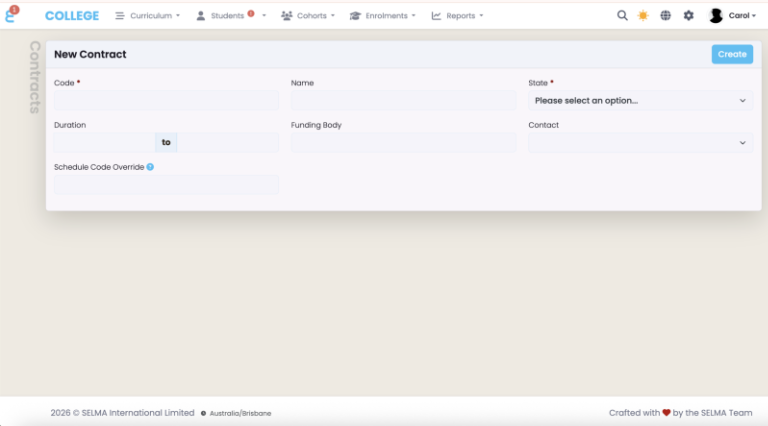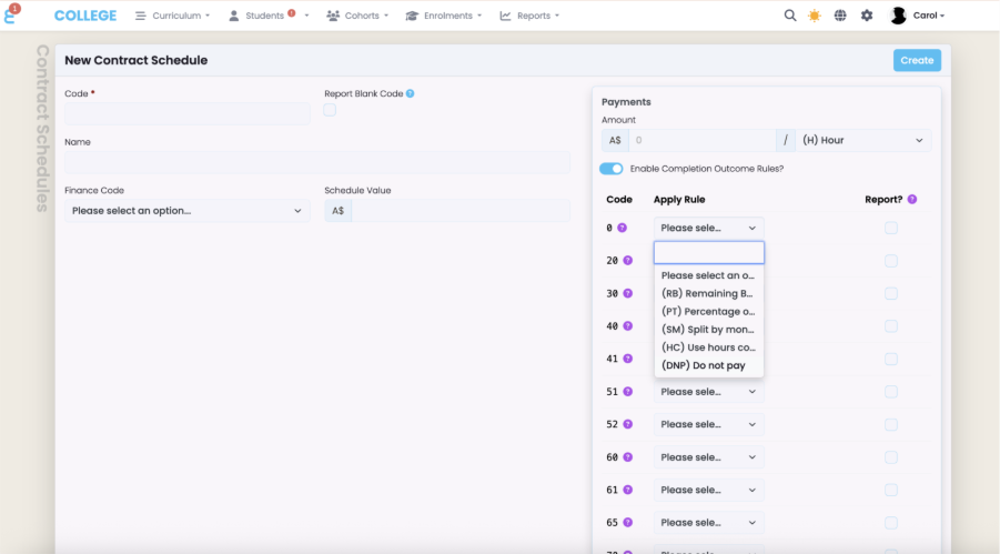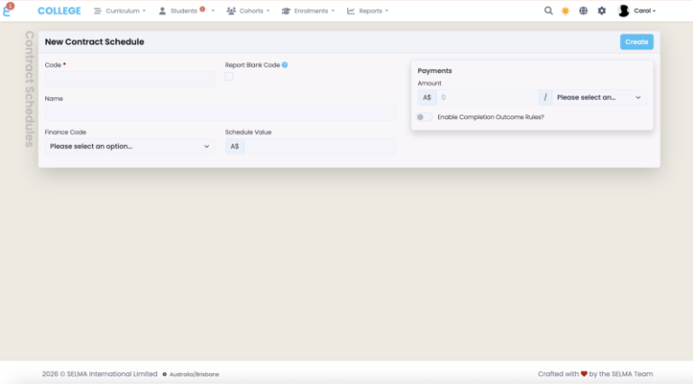 Click “Create”. The Contract Schedule is now active and available to assign to enrolments.