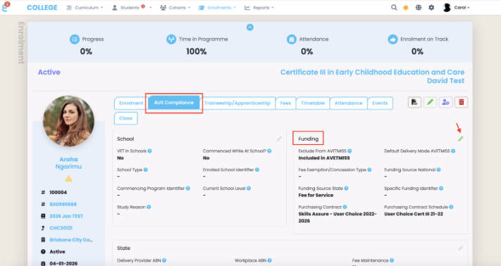 - Open the relevant learner enrolment record