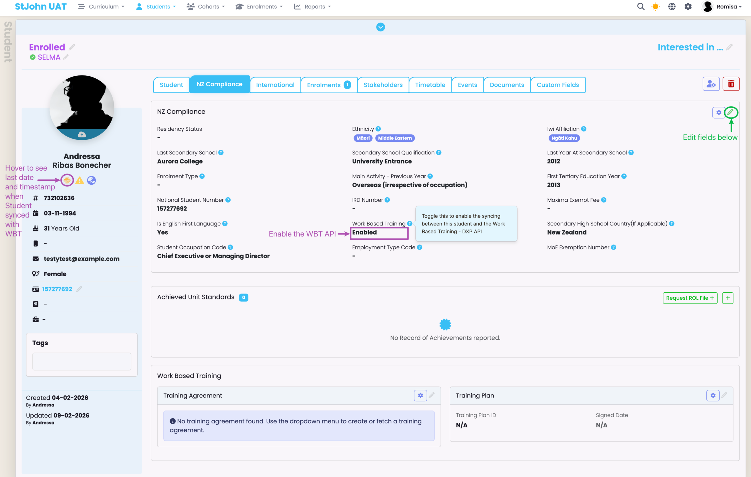 Enable the WBT API from the NZ Compliance card, below. This will run validation rules, and error messages will prompt you to fill out required fields that are empty. Hover on the WBT icon on the left hand panel to see the date and timestamp when the Student was last synced to the DXP Ngā Kete.