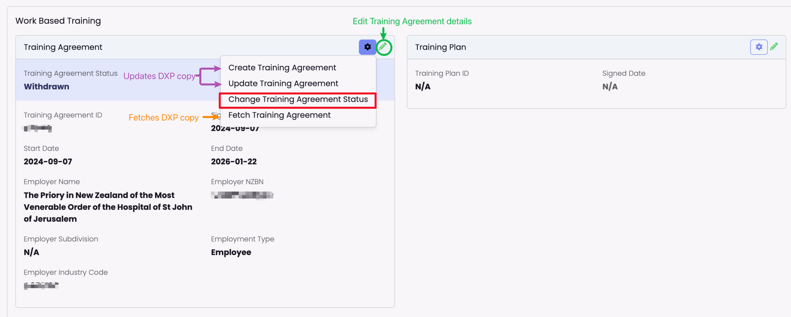You can perform four actions using the Training Agreement card on the Student’s NZ Compliance tab: