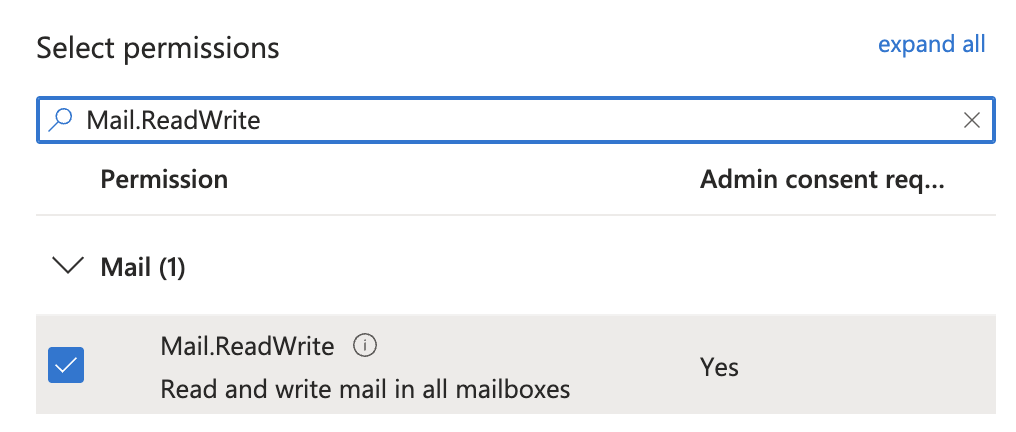 Add the “Mail.ReadWrite” permission. This allows setting up webhooks that enables users’/students’ replies (only to communication emails sent from within SELMA) to show up in SELMA.
