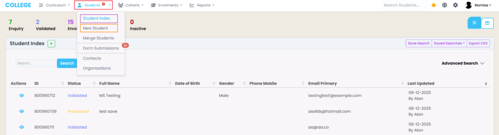 • Clicking the “Create and Enrol” button automatically updates the Student status to “Enrolled”.
