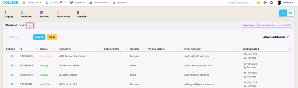 If you access the Student Index first, you will be taken to a page to view the student list before creating a new Student; in which case you should click the green cross icon (Figure 2.).