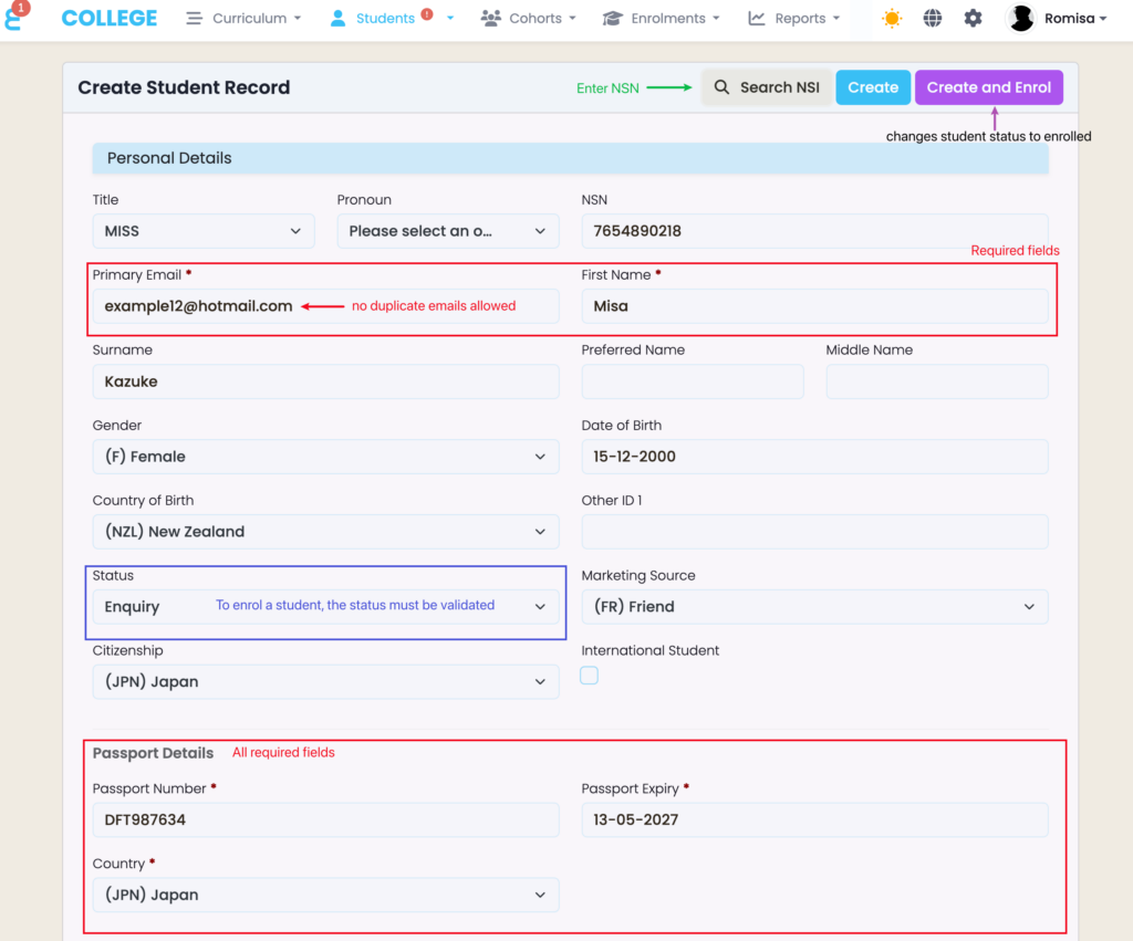 Figure 3. Required fields (red) should be filled out, and the student status changed to “Validated” to enrol the student at a later date (blue). Search by NSN (green) to populate the fields for you and double-check the details.