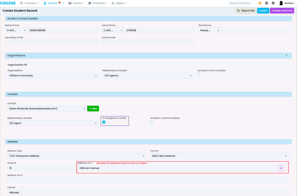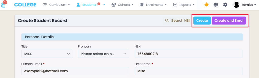 Figure 5. The blue “Create” button submits the student record to the Student Index without enrolling them. The purple “Create and Enrol” button takes you to to Enrolments and automatically updates the Student status to “Enrolled”.