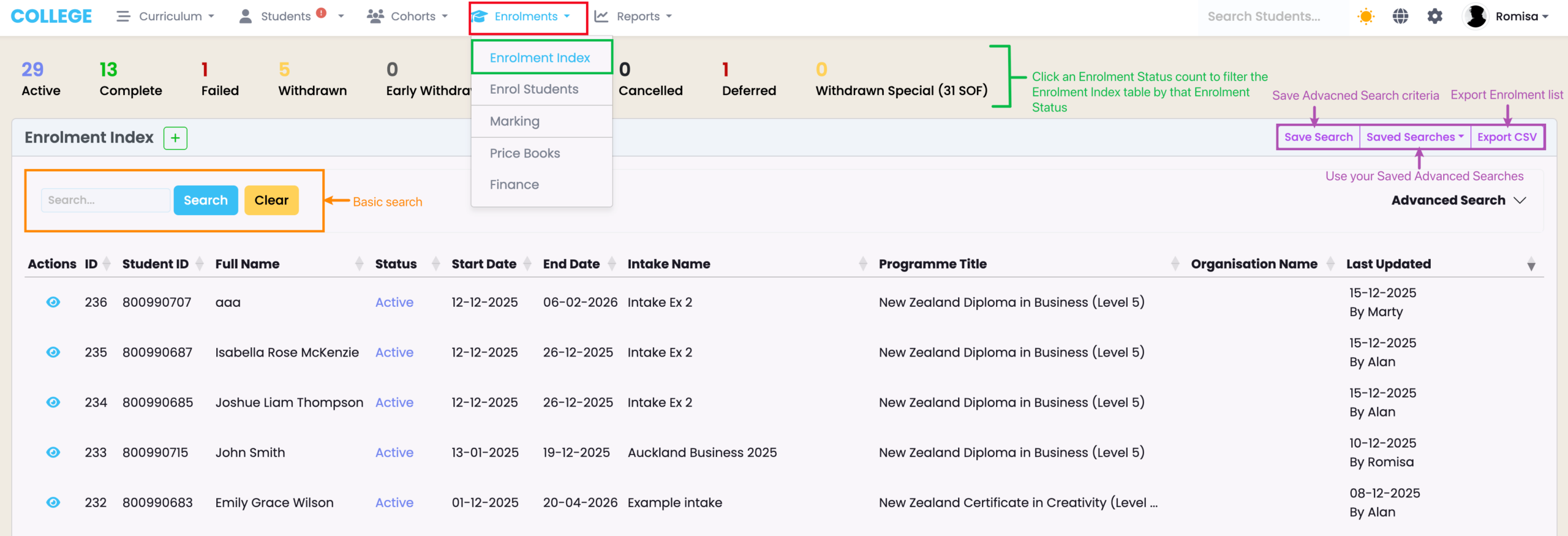 Figure 1. Access the Enrolment Index (red) via the top navigation bar (green). Use the basic Search (orange) or the Advanced Search, below the Save Search feature (purple).