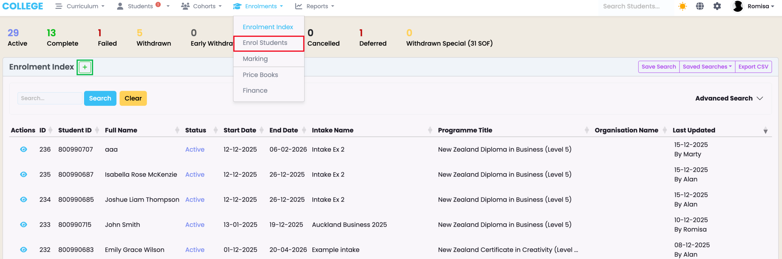 Navigate to Enrolments > Enrolment Index.