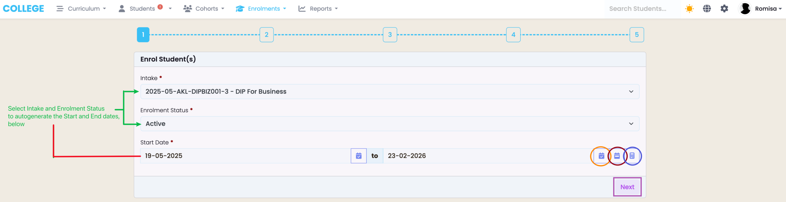 1. On the first screen, select the Intake and Enrolment Status. You will see that in doing so, the Start and End Dates will be automatically inherited by that of the selected Intake. Click the following buttons to auto-generate different dates (Figure 3i.):