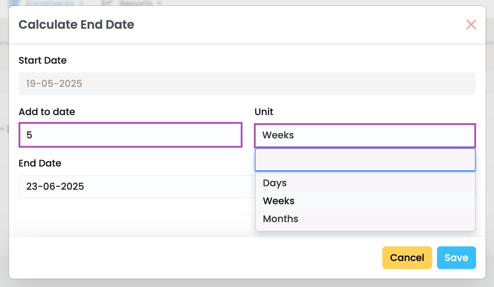 • Blue circle – Calculates an End Date based on the number of units you add to the Start Date (see also Figure 3ii.).