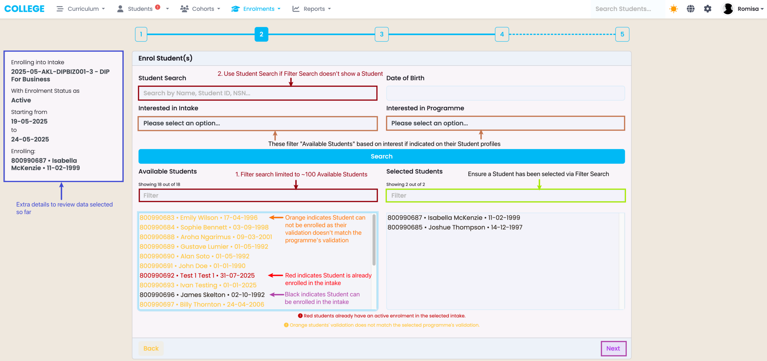 Figure 4. Filter by group interest in Intakes or Programmes (brown) if indicated on the Student profiles, and select available students to be enrolled (purple arrow). Use the Filter Search to find and ensure a Student has been selected (neon green).