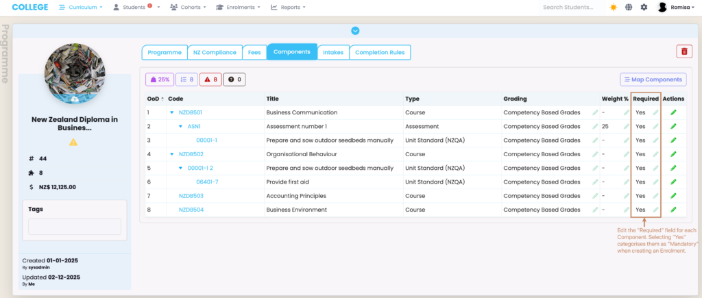 Figure 5ii. Edit which Components are “Required” for Enrolments, at the Programme | Components Tab.