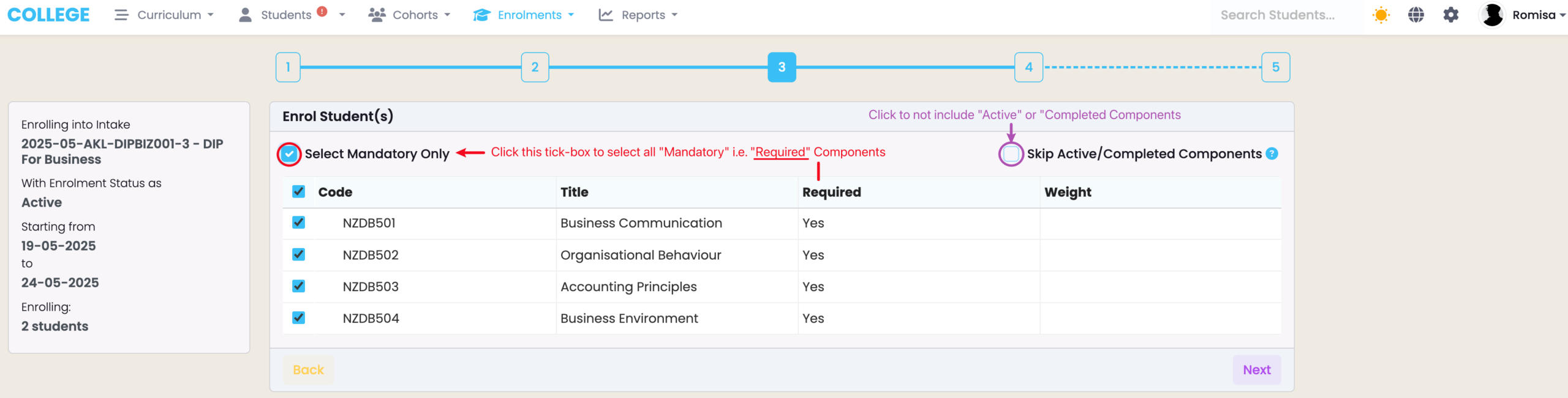 Figure 5i. Select all “Required” Components by clicking the “Select Mandatory Only” tick-box (red). Skip Components that are present in “Active” enrolments or already successfully completed (purple).