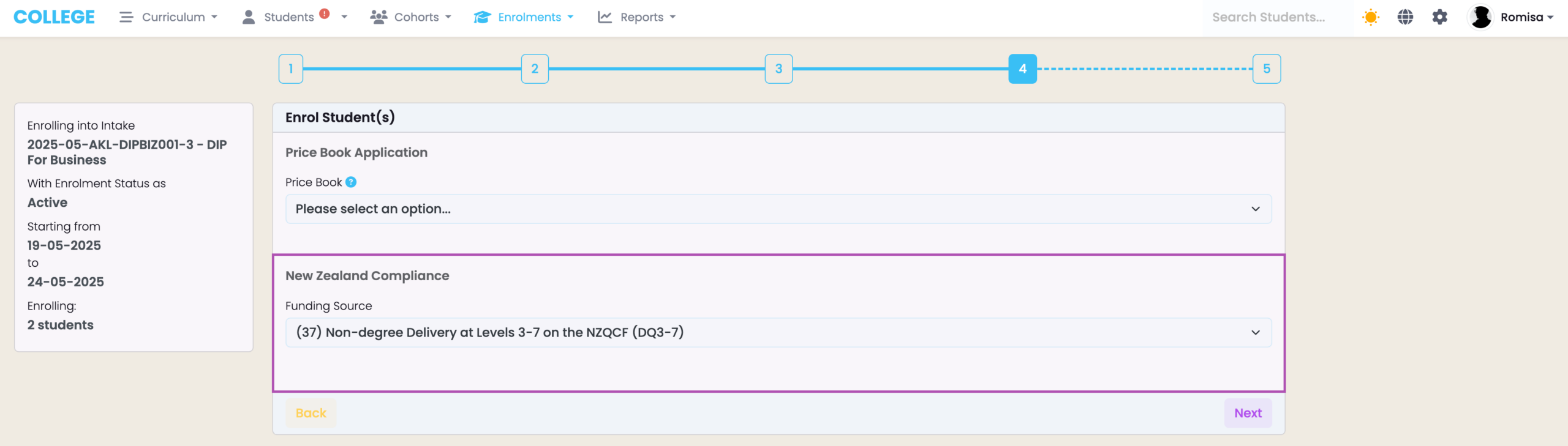 4. On the fourth screen, apply a Price Book and set a Funding Source for NZ/AUS Compliance.