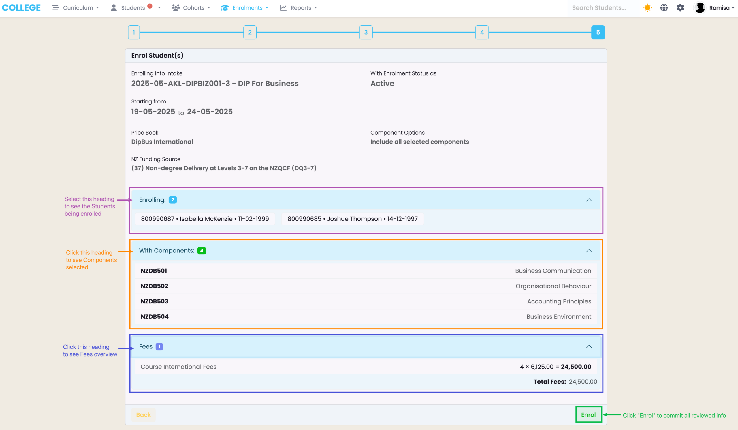 Figure 7. Review all information selected, and click to open each heading (purple, orange, blue arrows) for more information. Click “Enrol” to submit all (green).