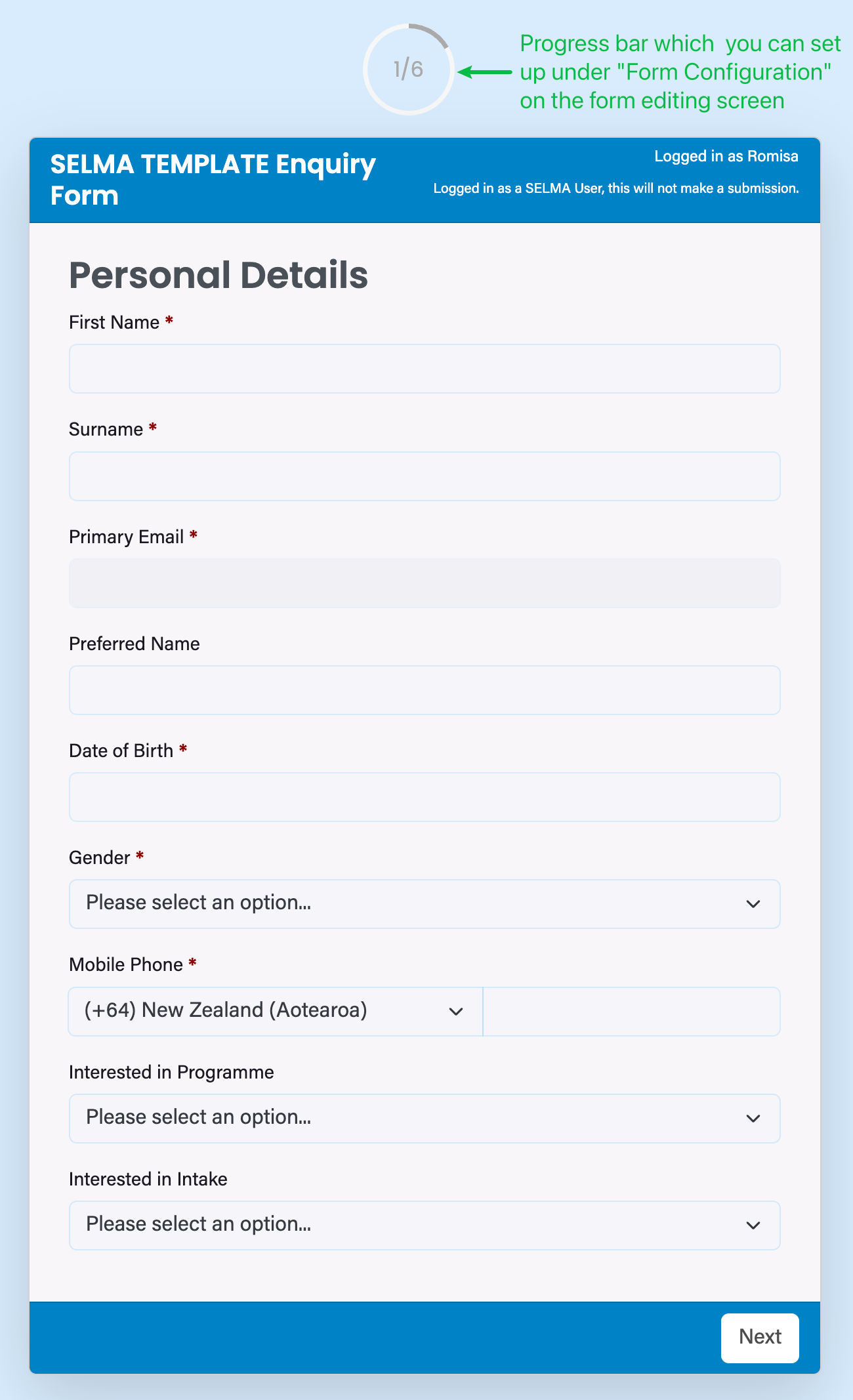 The Enquiry Form can be used to gather basic information from interested applicants, or complete expression of interest applications.