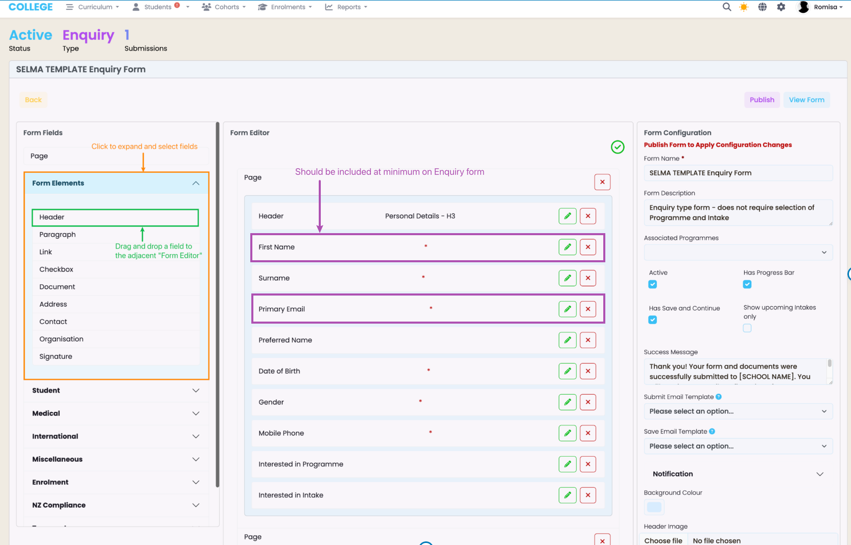 Use “Form Fields” to drag and drop fields to the “Form Editor” (green), and use the Form Editor to edit field labels, add “help” messages, and add “Required” fields, as indicated by red asterisks. Set-up the “Form Configuration” on the right-hand panel.
