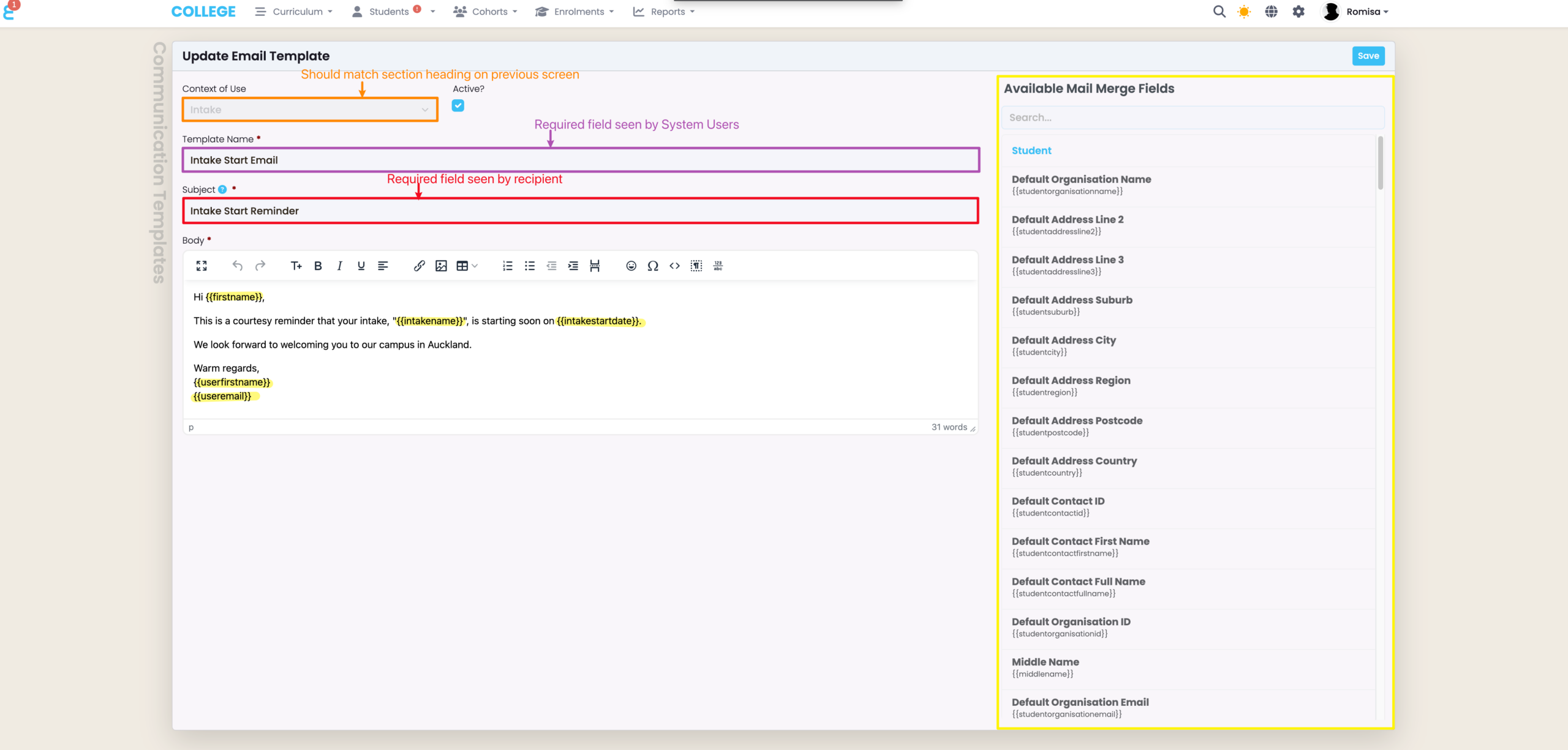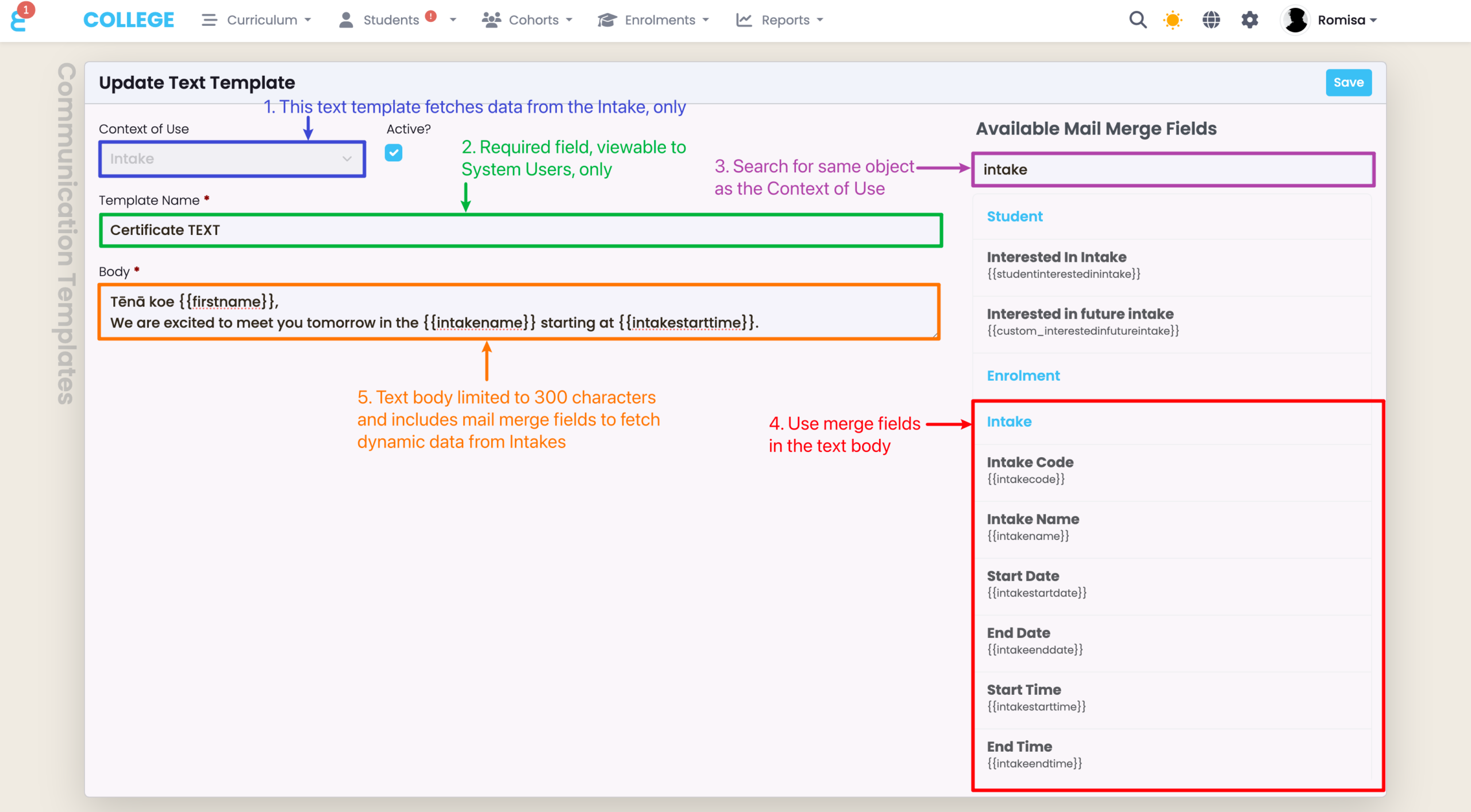 “Context of Use” (orange) restricts the Communication Template to map data from a specific object in SELMA e.g. “Intake” sends an email to a Student/s of an Intake, while “Student” sends an email to Student profiles.