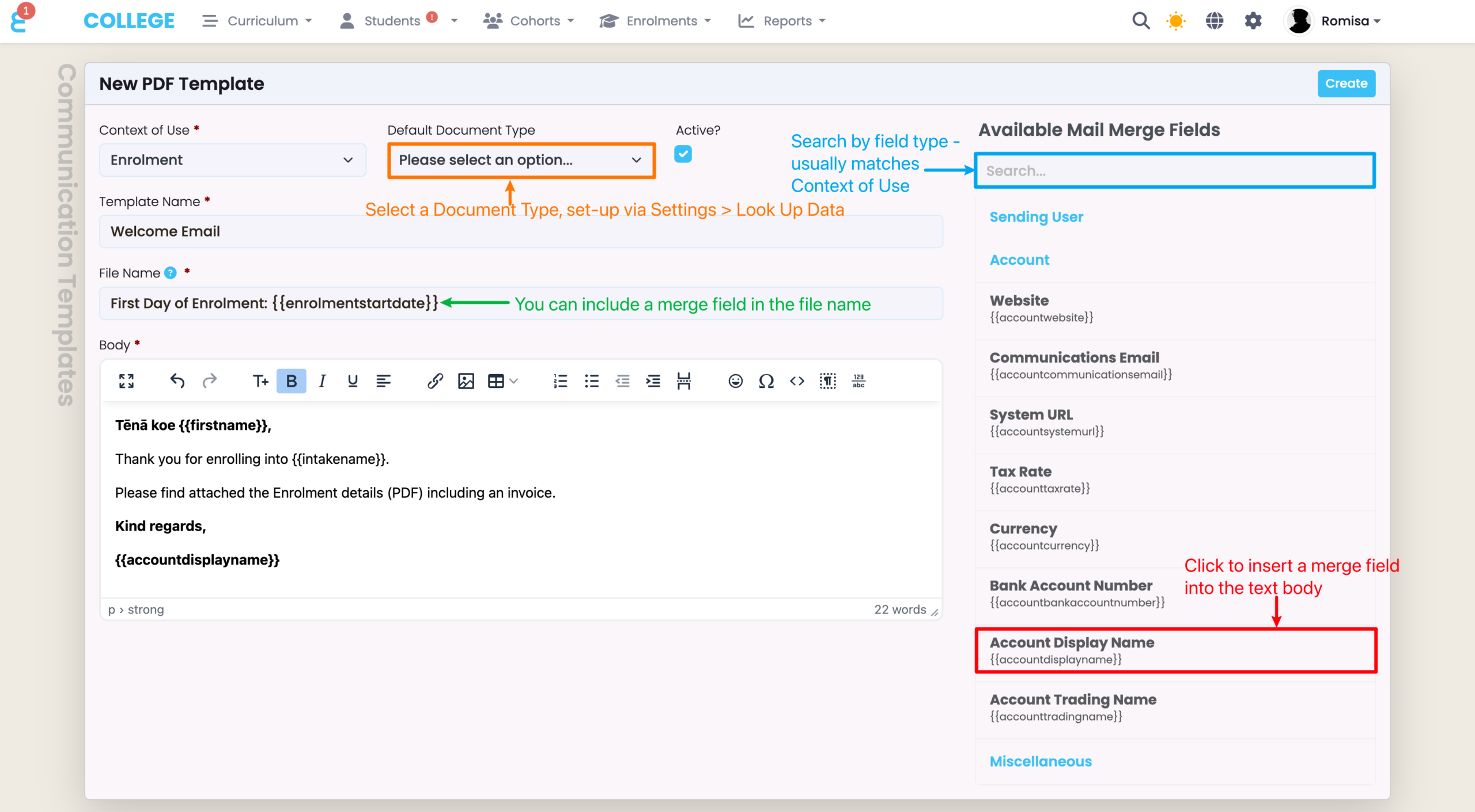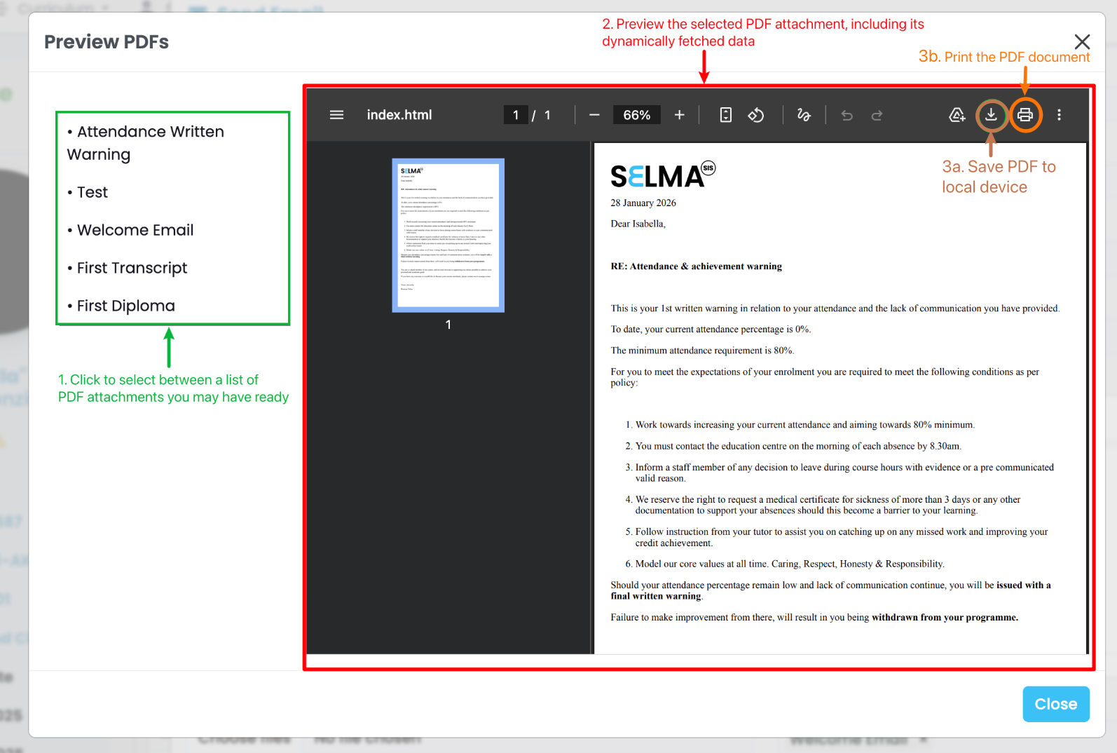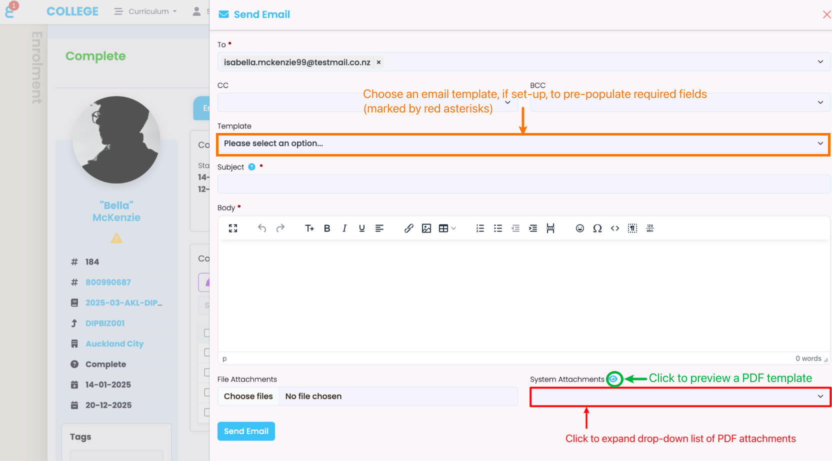PDF attachment templates are attached to emails that can be sent to Students.