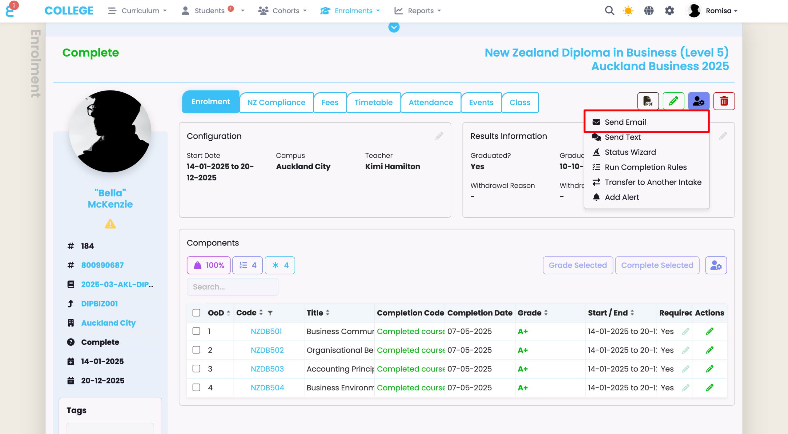 Once an Email is set-up they can be accessed and sent from the Intake, Enrolment and Student levels.