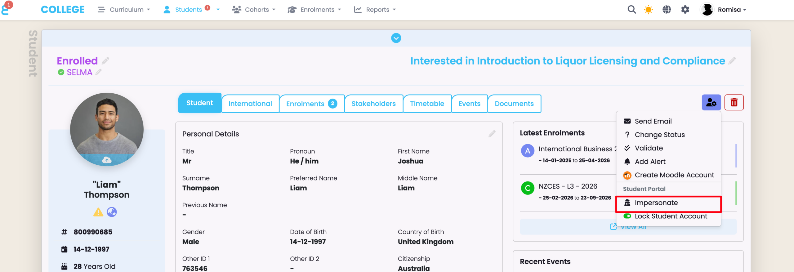 Impersonation allows you to see the Student Portal from the Student’s view.