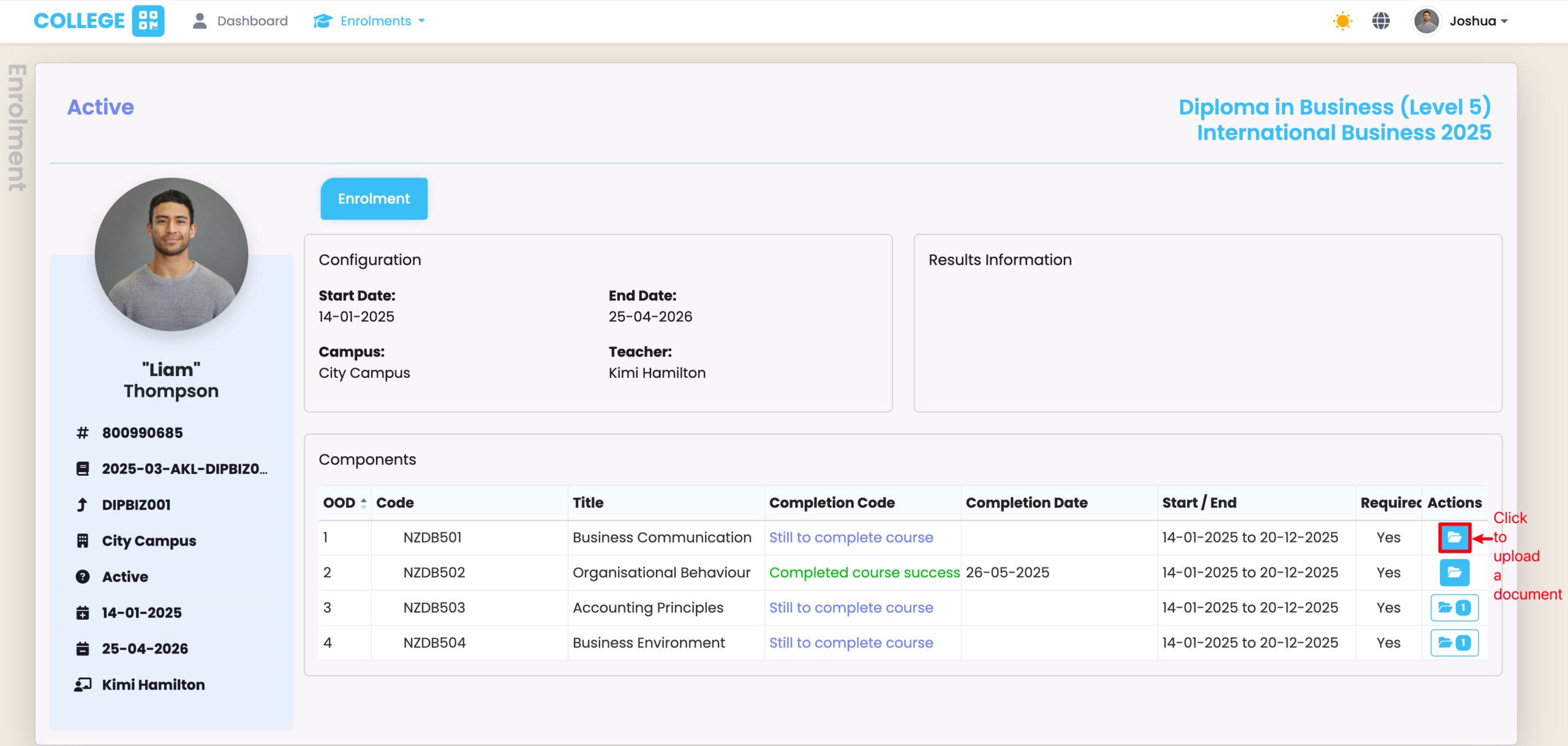 Click the blue highlighted text to open an Enrolment; (you can also select an Enrolment from the Enrolments tab (orange)).