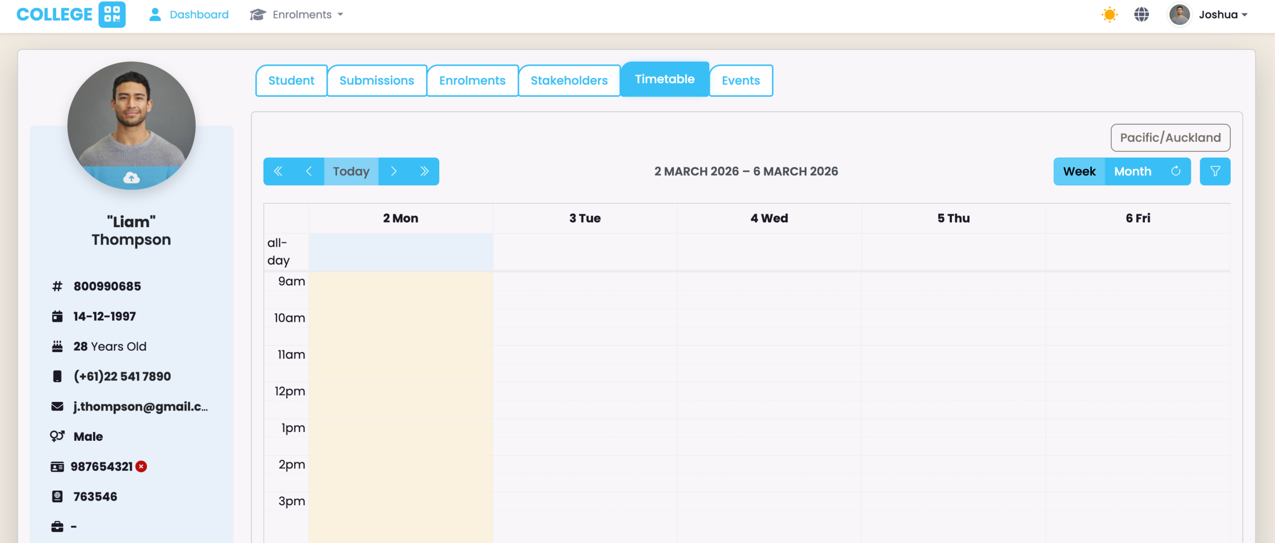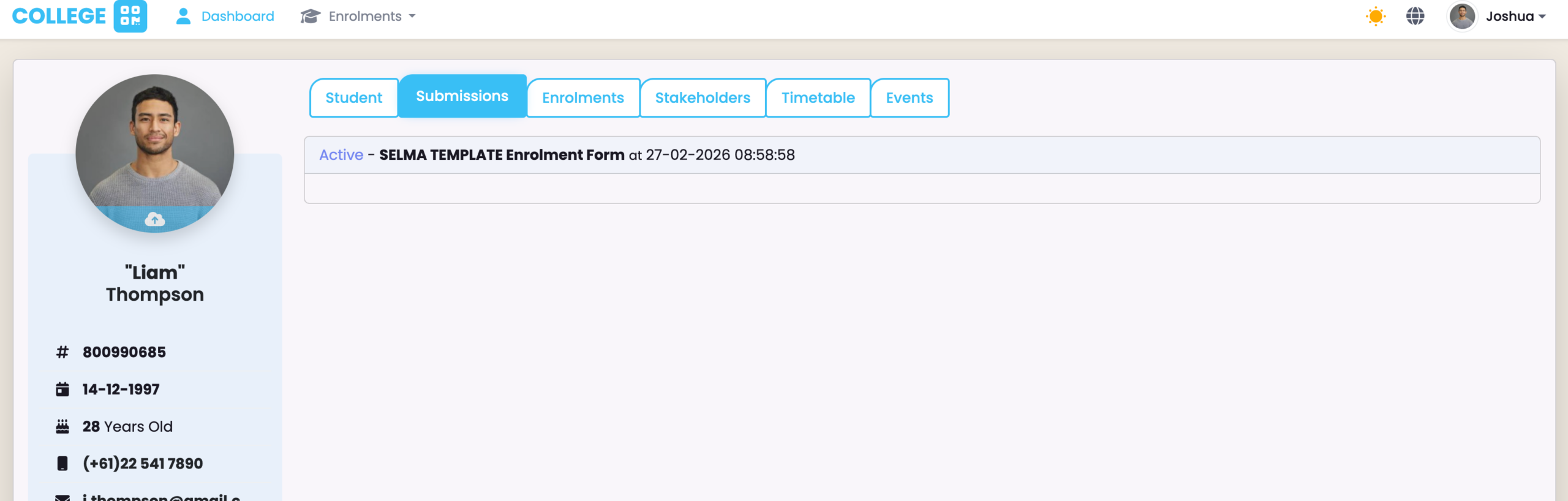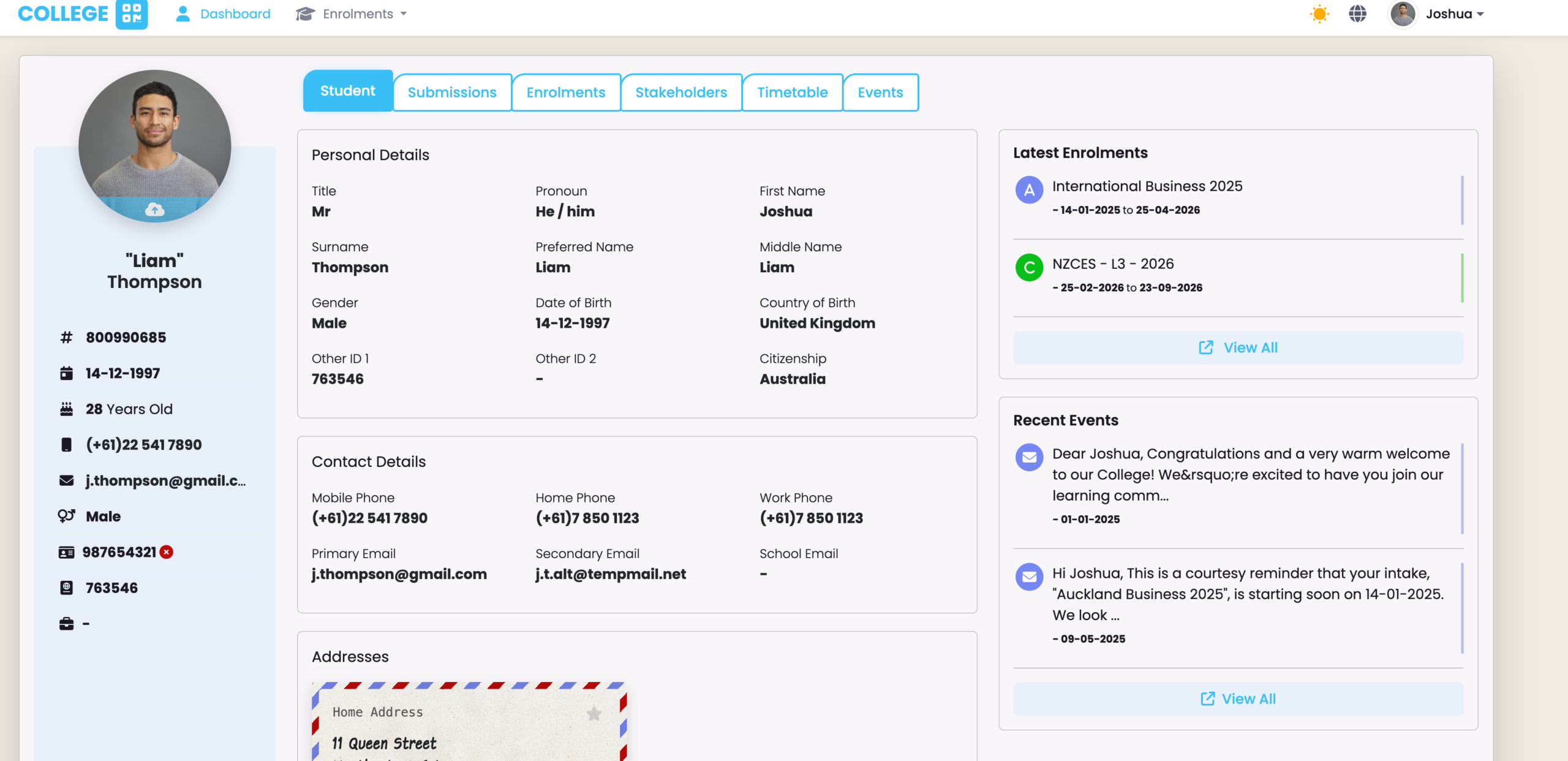 On the Student tab, you can see your Personal Details, including your Names, Country of Birth, Date of Birth, and Addresses. On the right, you will see your Latest Enrolments and Recent Events, which are communications sent by your education provider.