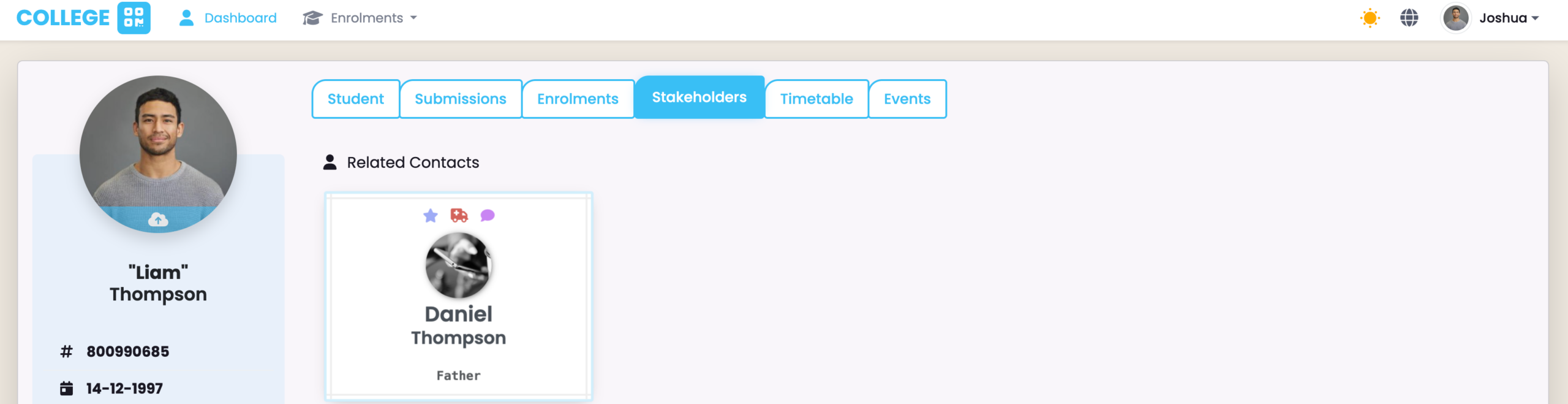 The Stakeholders tab holds information about your related Contacts. Click a card to flip it and reveal more details. Icons on the front of the card indicate if a Contact is listed as a Primary Contact (star), Emergency Contact (ambulance), and CCed in all communications (speech bubble) sent to you by your education provider.