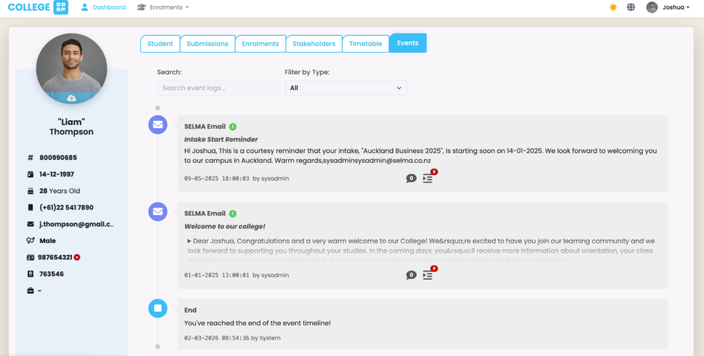 While you can see a quick overview of communications on the Student Tab, you can see a list of all communications on the Events tab.