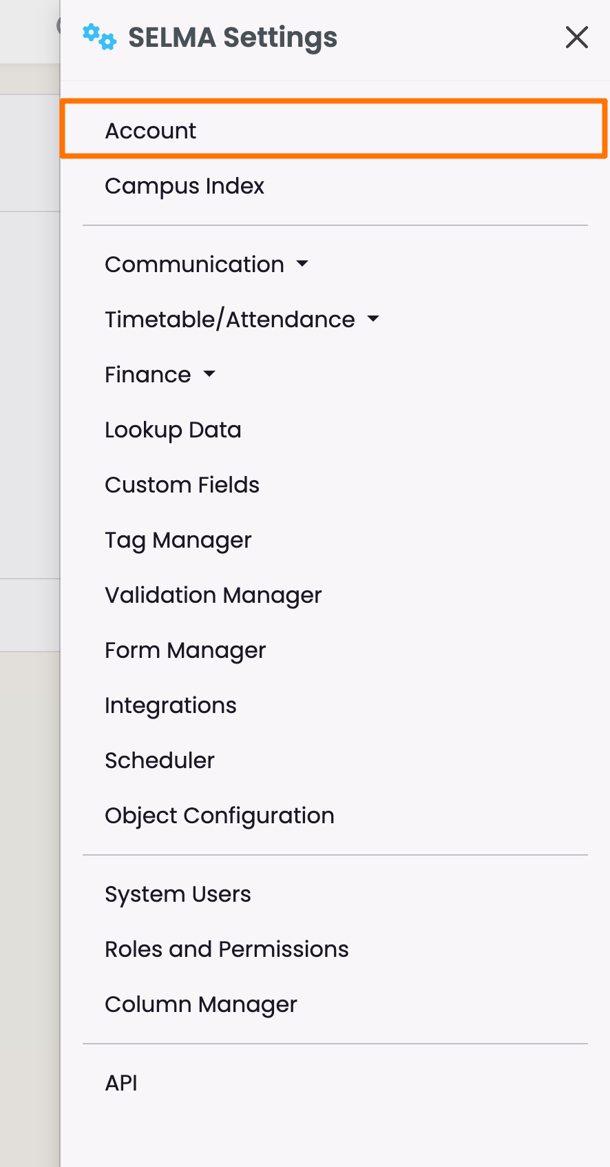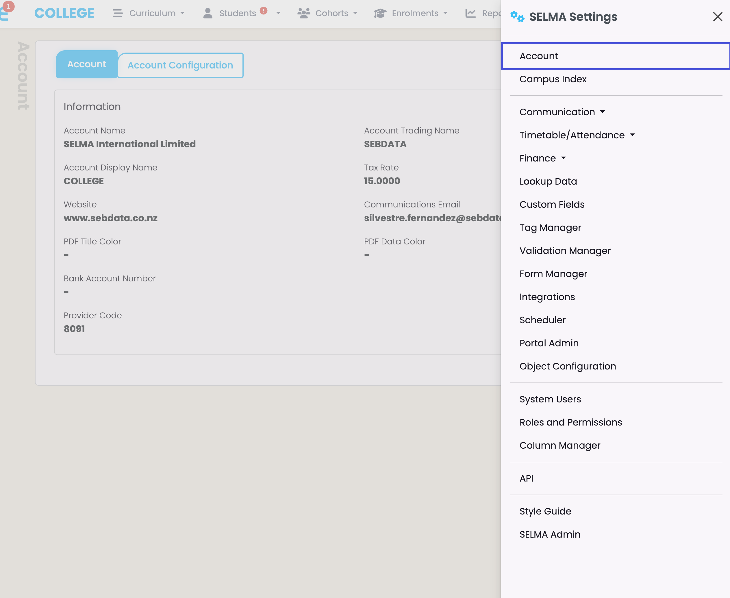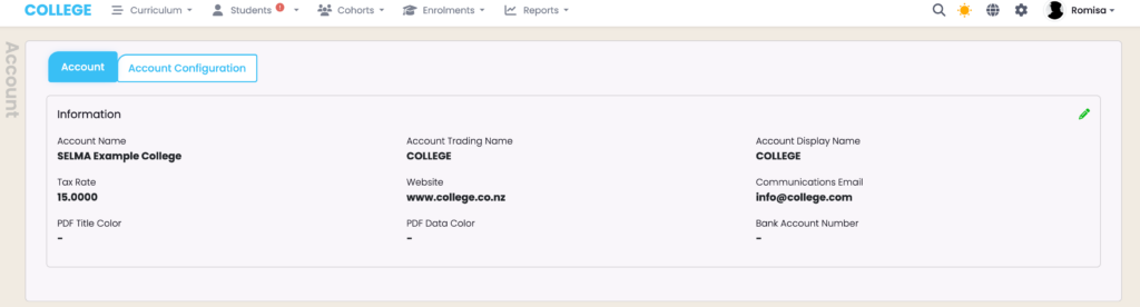 The Account tab is where you can make changes to the basic details set-up by SELMA.
