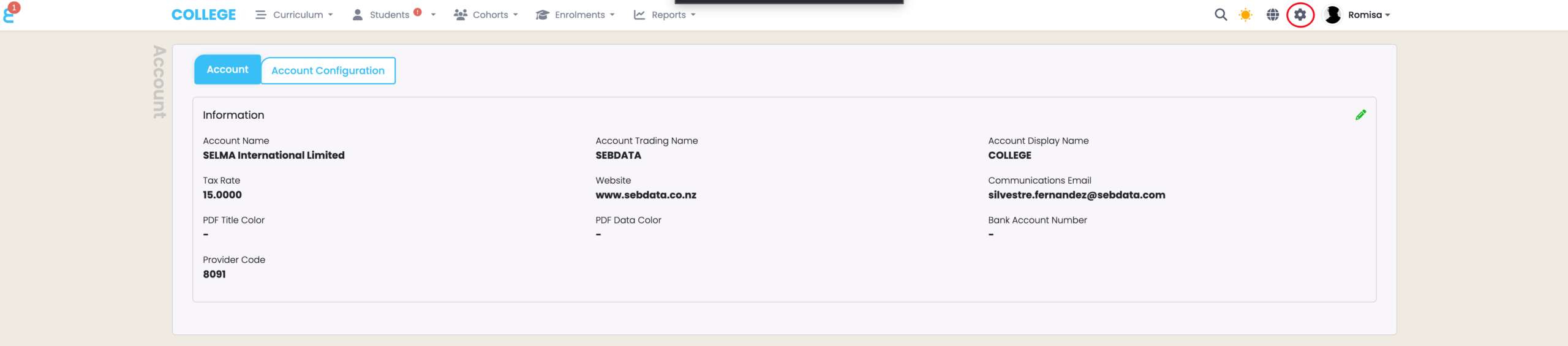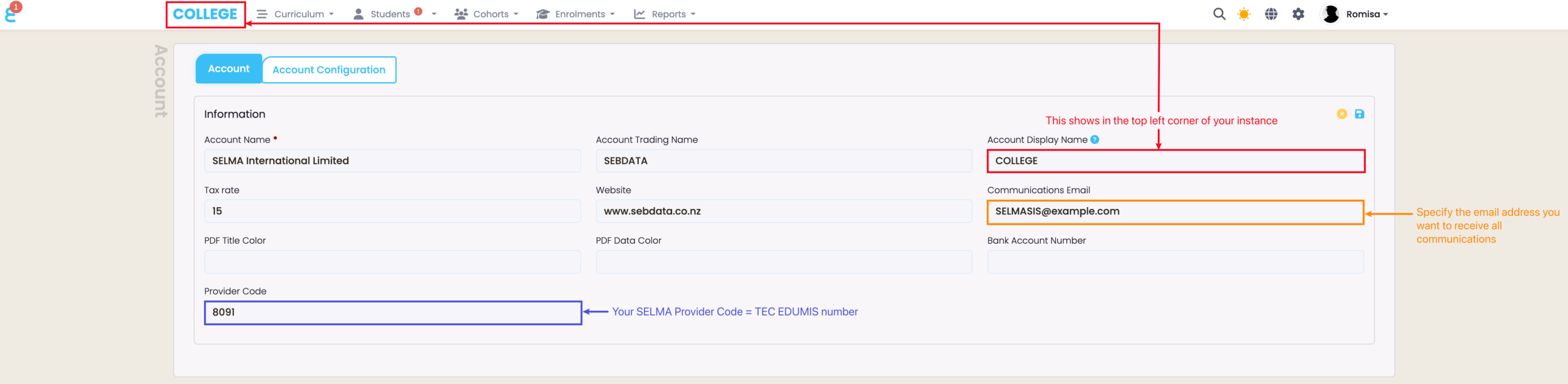 Set-up key parameters such as your Account Display Name, EDUMIS/Provider Code, and your email address for all SELMA communications, such as emails, texts and copies of form submissions (if the form module is enabled).