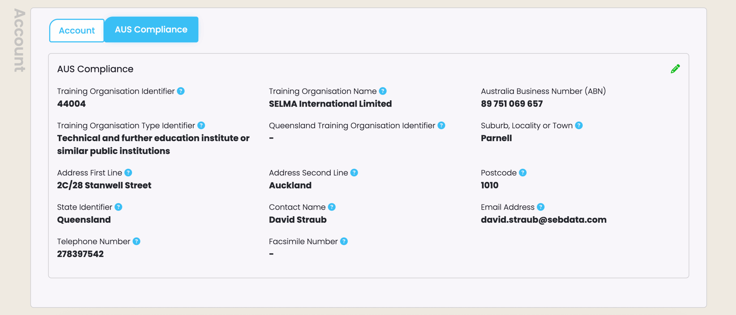 Australian-based providers will see an additional tab under their Account: “AUS Compliance”.