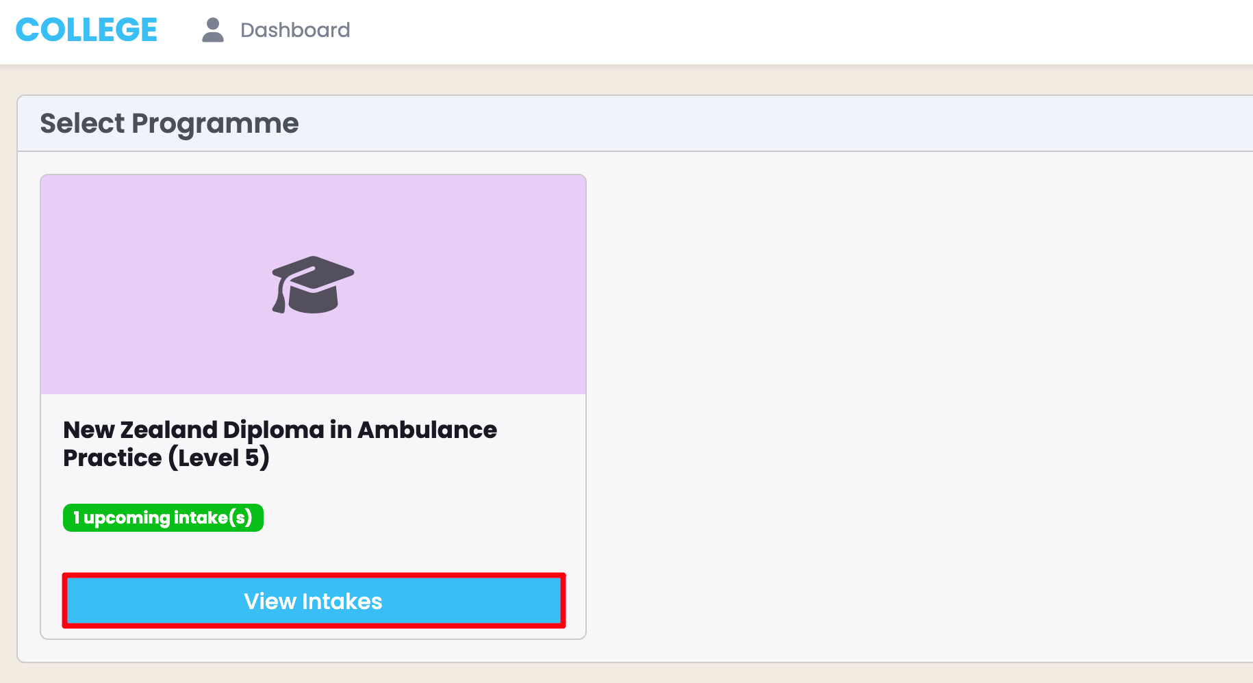 You will see all available Programme/s, here. Click the “View Intakes” button to select a Programme.