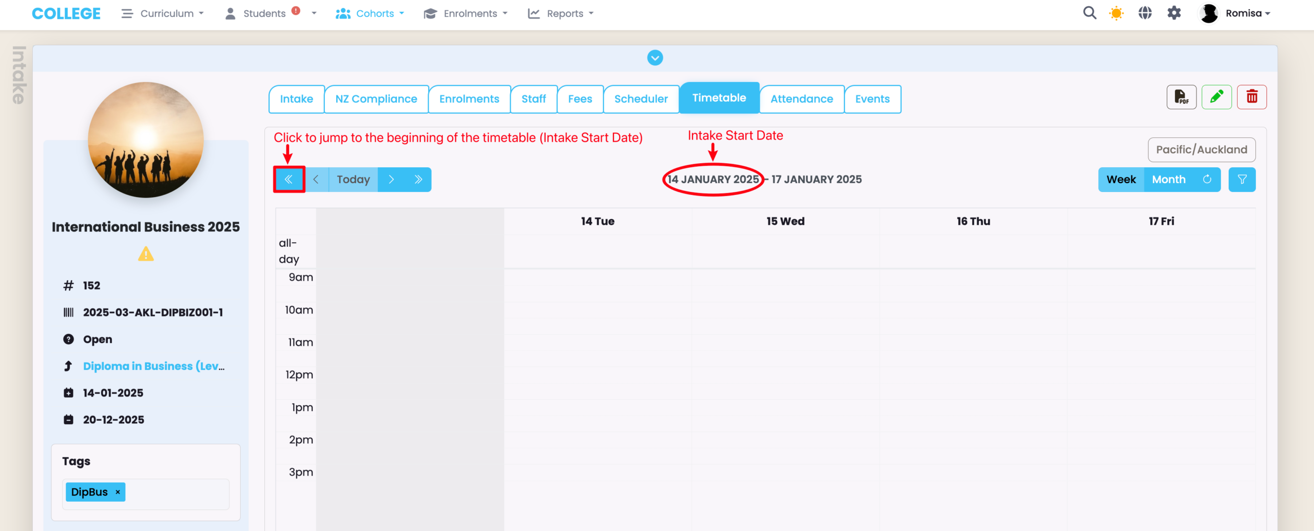 On a select Intake, navigate to the Timetable tab, and click the “<<” arrow to jump to the beginning of the timetable.