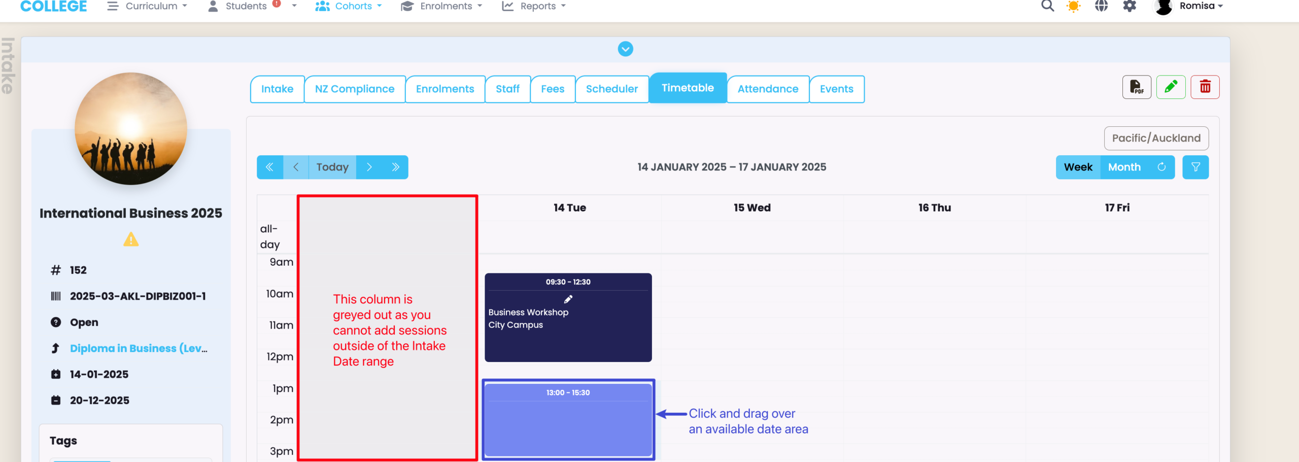 To create an Timetable session, click over a start time on an available day, and drag your mouse to the end time.