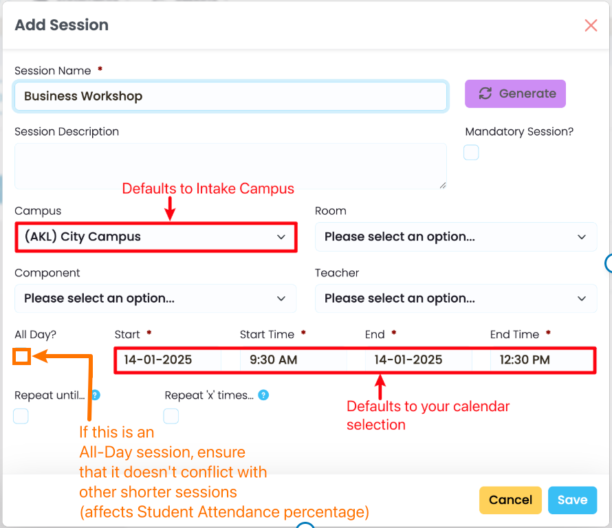 Fill in the required details, as indicated by red asterisks, and click the blue “Save” button. The Date and Start and End time of the session will be auto-populated, as per your calendar selection, and the Campus will default to that of the Intake.