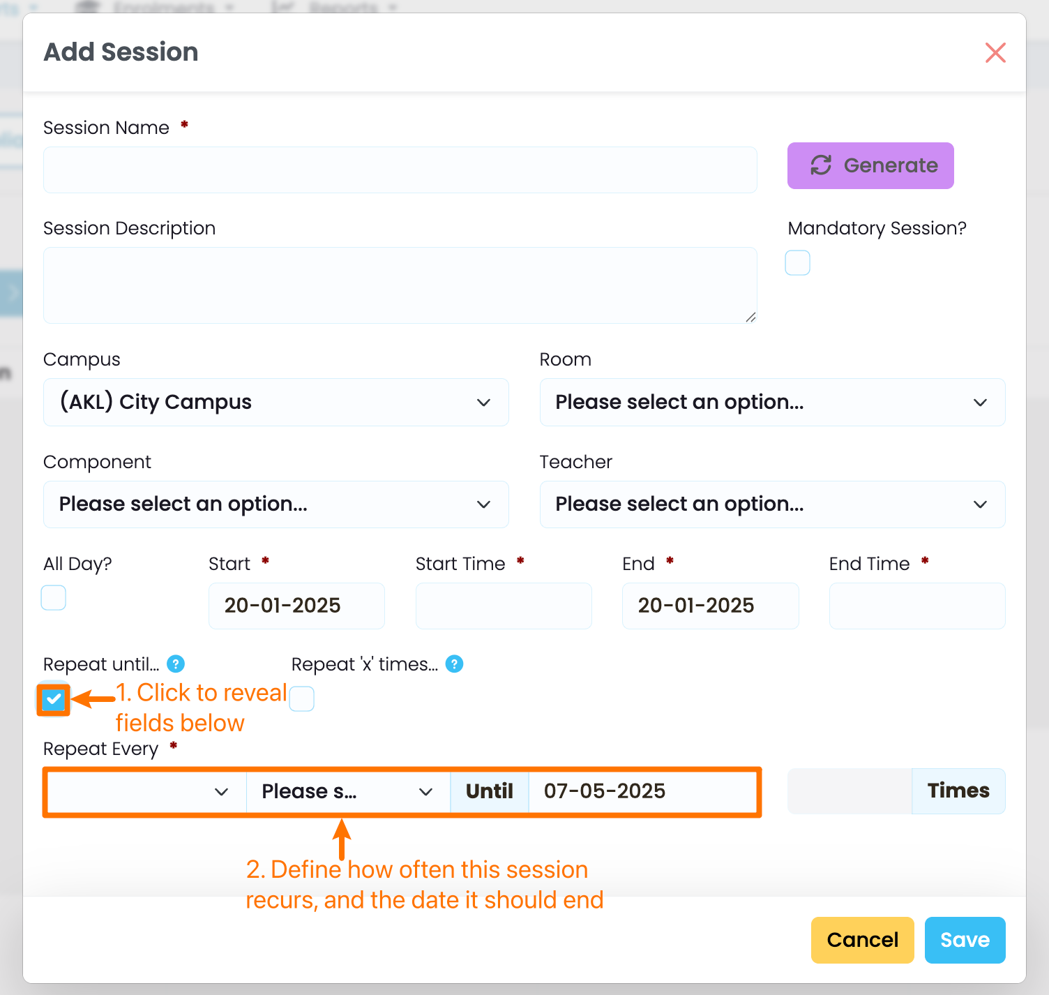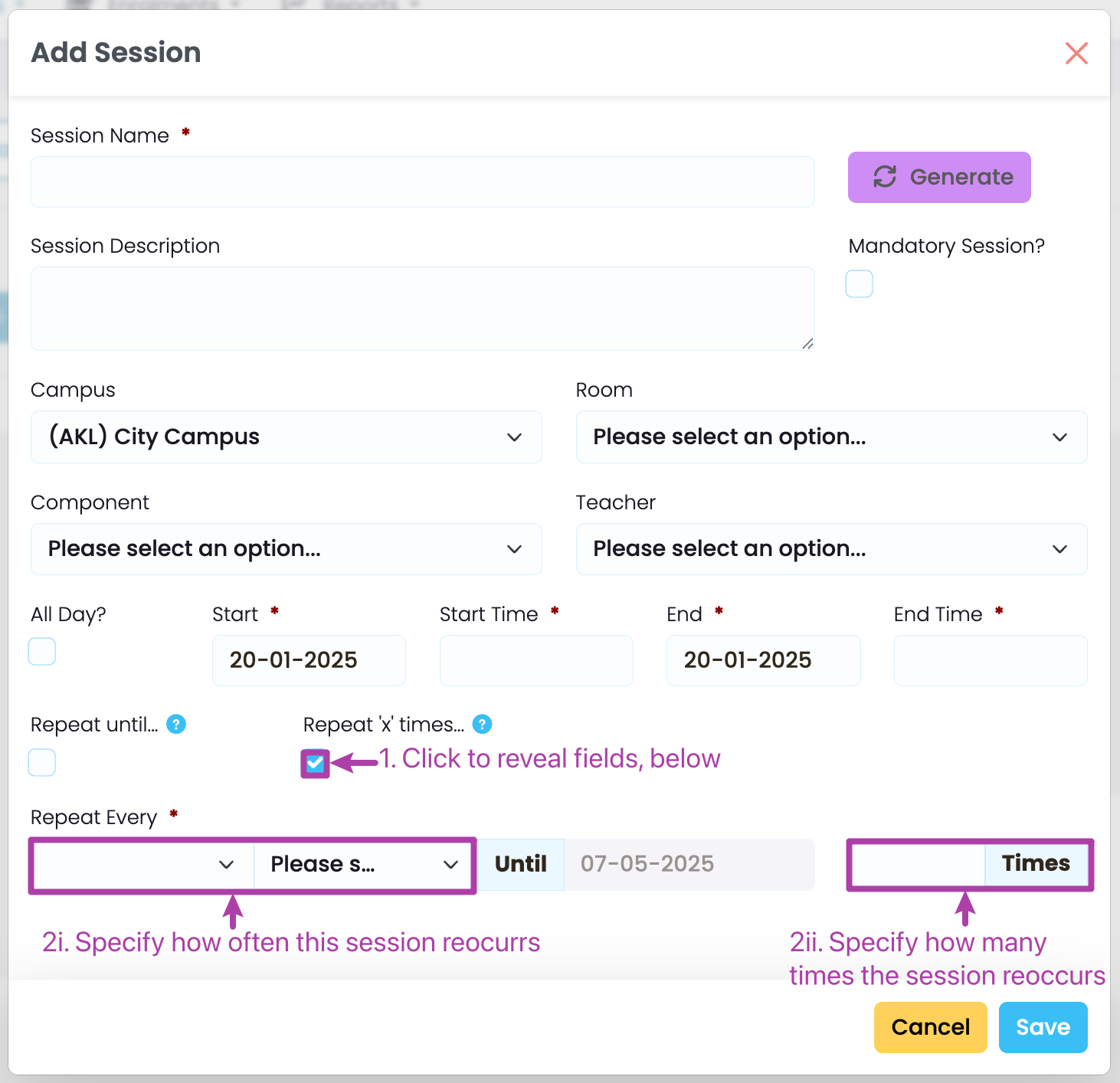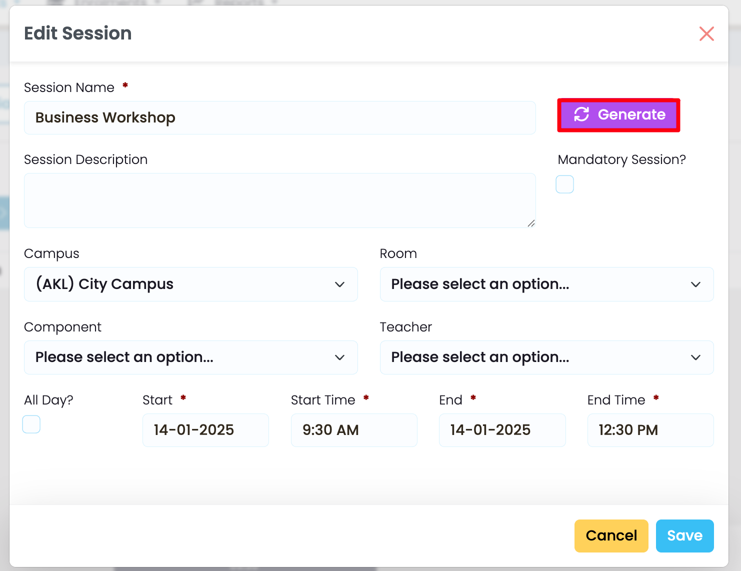 On the timetable session editing screen, click the purple “Generate” button.