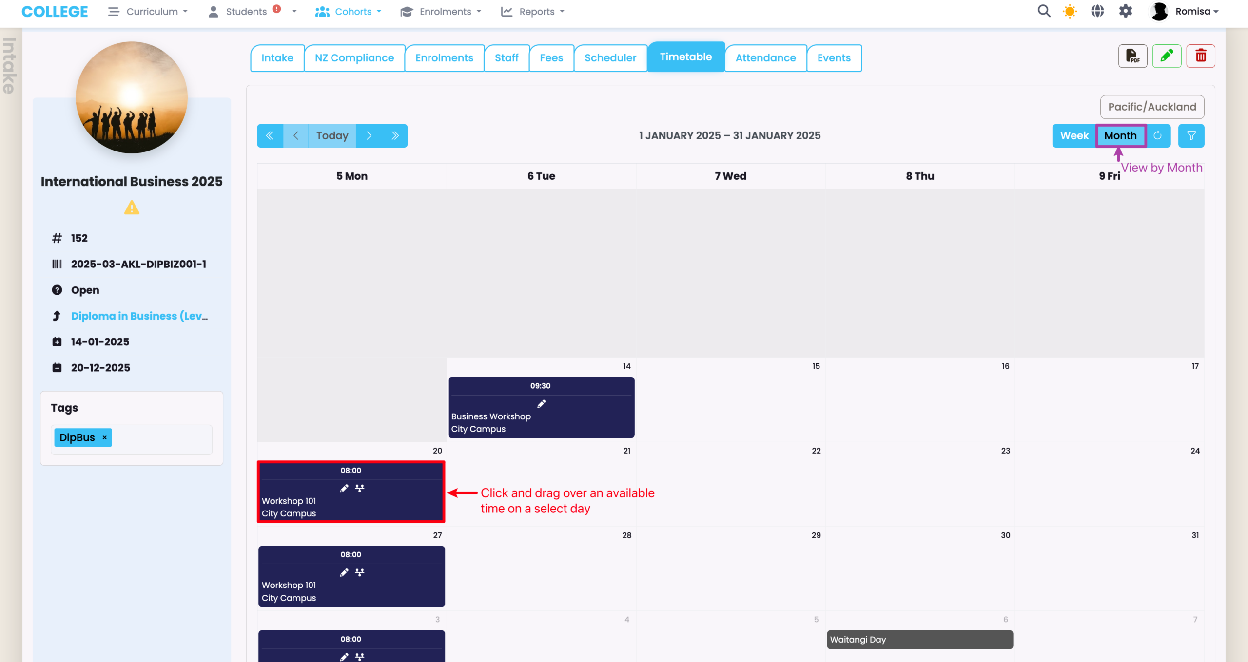 To create a recurring timetable session, change to a monthly view (purple), and click and drag over a time area on a select day.
