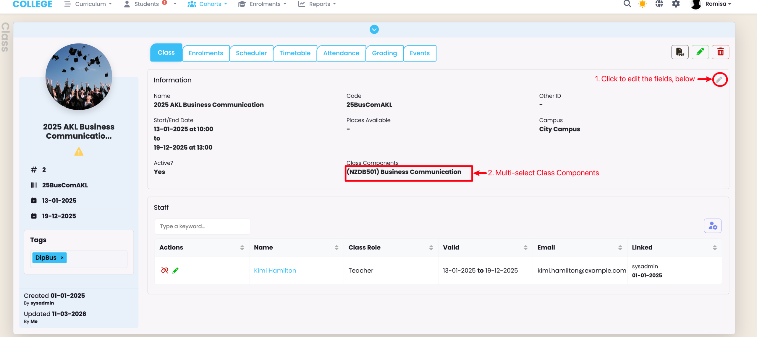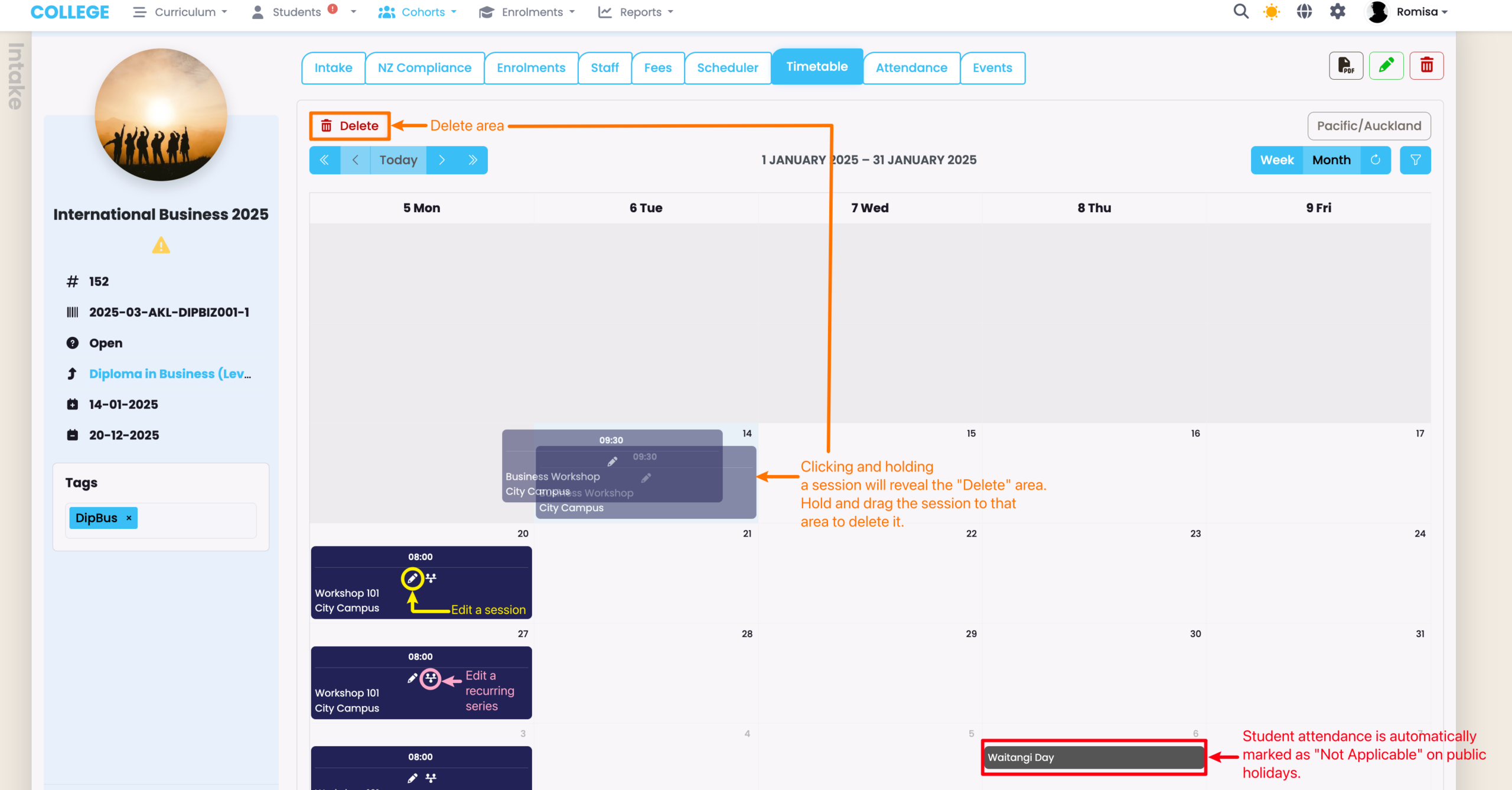 Note: You will not be able to edit timetable sessions which have been set-up at the Class or Intake level.